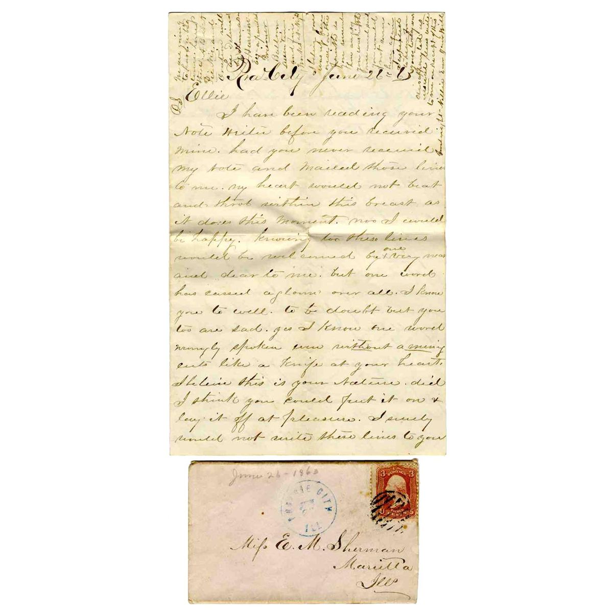 4pp. ALS from Union soldier ''William'' to his lover while in Prairie City, Illinois. Pencil letter dated 22 June 1863 and reads in part: ''…I have been reading your note write before you received mine had you never received my note and mailed those letters to me my heart would not beat and throb within this breast as it does this moment now I would be happy knowing too these lines would be welcomed by one very near and dear to me but one word has caused a gloom over all. I know you to well so I would bet you too are sad. yes I know one word wrongly spoken even without a meaning cuts like a knife at your heart…I have spared no pains to inform you I loved you and wished you more than a friend the manner in which I asked you to give yourself to me sounds about ruff and rude. Nellie where are you going to spend the fourth of July. I wish I could be with you but maybe that ideal will come around perhaps you will enjoy yourself better than you would with me. I shall have a nice time if I don't get killed. The committe of arrangements have give me the charge of the canon…'' Measures 5'' x 8''. Pinholes, otherwise fine condition.