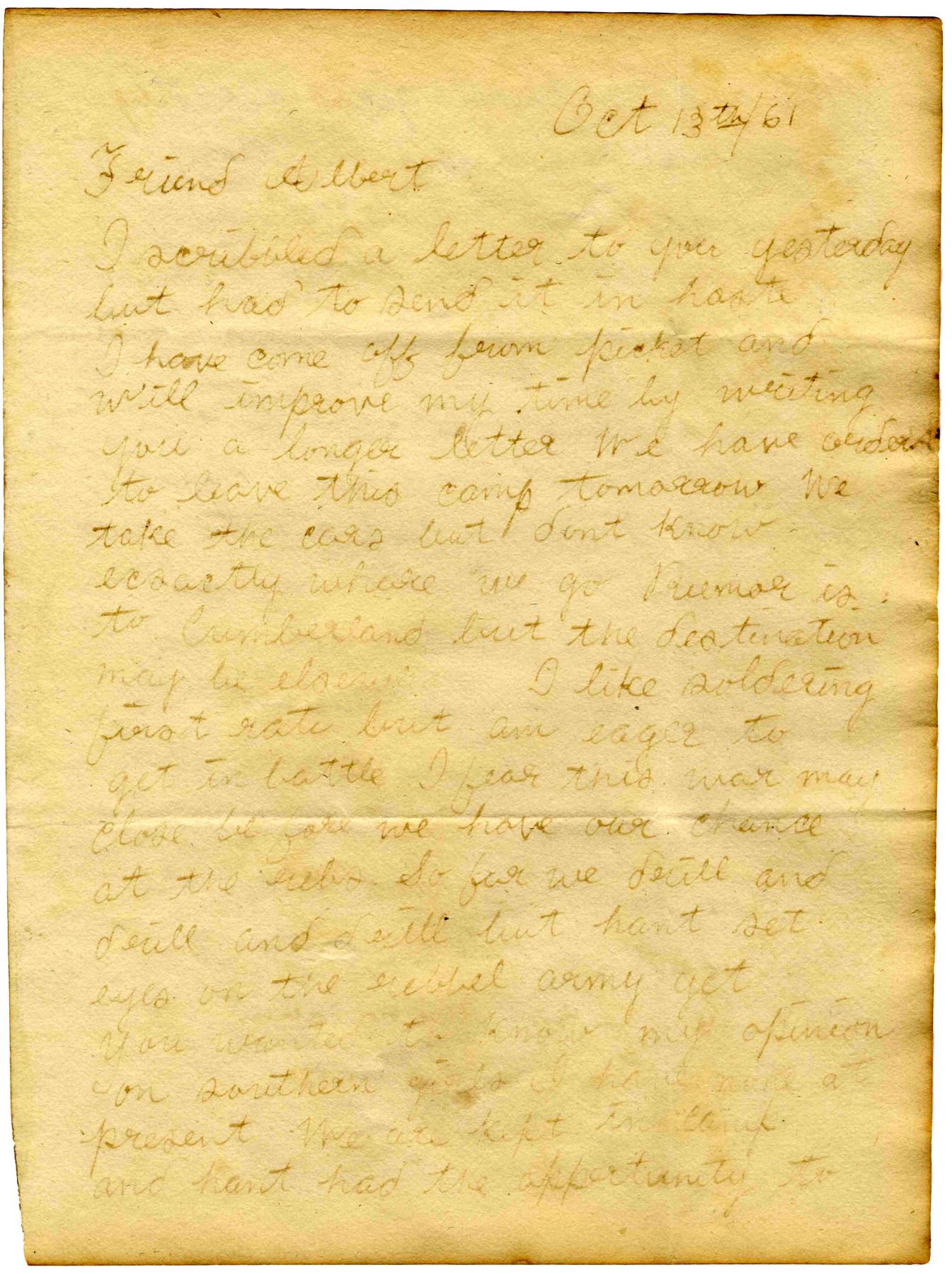 2pp. Union soldier ALS. Datelined 13 October 1861, letter reads in part: ''Friend Albert I scribbled a letter to you yesterday but had to send it in haste. I have come off from picket...We have orders to leave this camp tomorrow. We take the cars but dont know ecsactly whare we go. Rumor is to Cumberland but the destination may be elsewhare. I like soldering first rate but am eager to get in battle. I fear this war may close be fore we have our chance at the rebs. So far we drill and drill and drill but hant set eyes on the rebbel army yet. You wanted to know my opinion on southern girls. I have none at present. We are kept in camp and hant had the oppertunity to meet any southern girls directly. Have you seen Lydia or Mary. I have had but one letter from Lydie and none from Mary...I think they have forgotten me...If you see Lydie tell her I am disappointed that her resolve to write me has failed her so soon. Tell all my friends to write me the news of home...your friend Tomy.'' Letter measures 6'' x 7.75'' and runs 2pp. Light toning and fading to ink, otherwise very good condition.