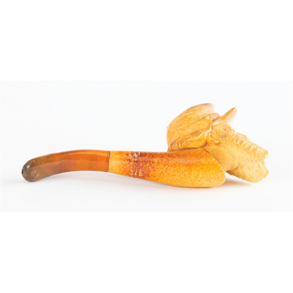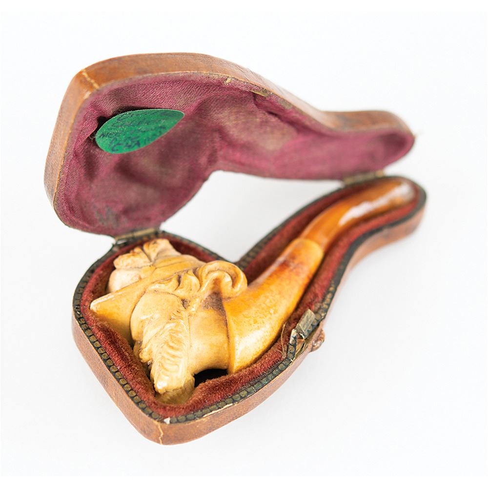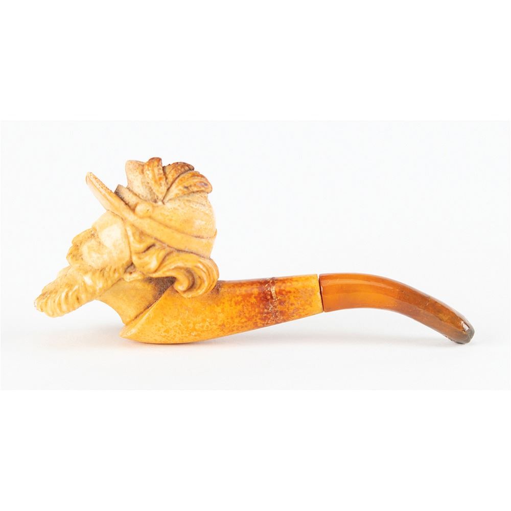 Attractive hand-carved meerschaum smoking pipe portraying a bearded Union soldier, measuring 3.25" long, housed in its original, form-fitting hinged leather case. In fine condition.