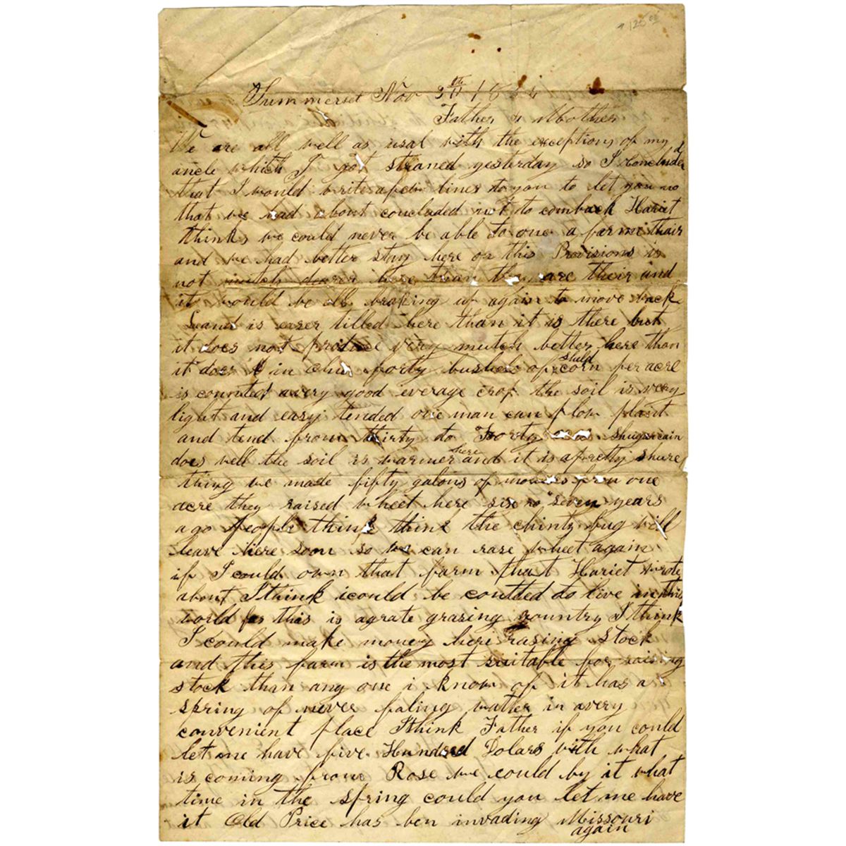 Letter by unidentified soldier addressed to his parents regarding the Union defeat of General Price. Datelined, ''Somerset [Ohio] Nov. 9th 1864,'' letter reads in part, ''…Father & Mother…Old Price has left Missouri and is move in Kansas the report is that our men have taking all of his cannon and his supply [?] and had killed some eight thousand of his men and he had disbanded the rest of them…'' 7.75'' x 12'' letter runs 2pp. written in black ink. Some toning and bleedthrough though text remains legible. Inexpertly repaired with tape to edges. Overall, good condition.