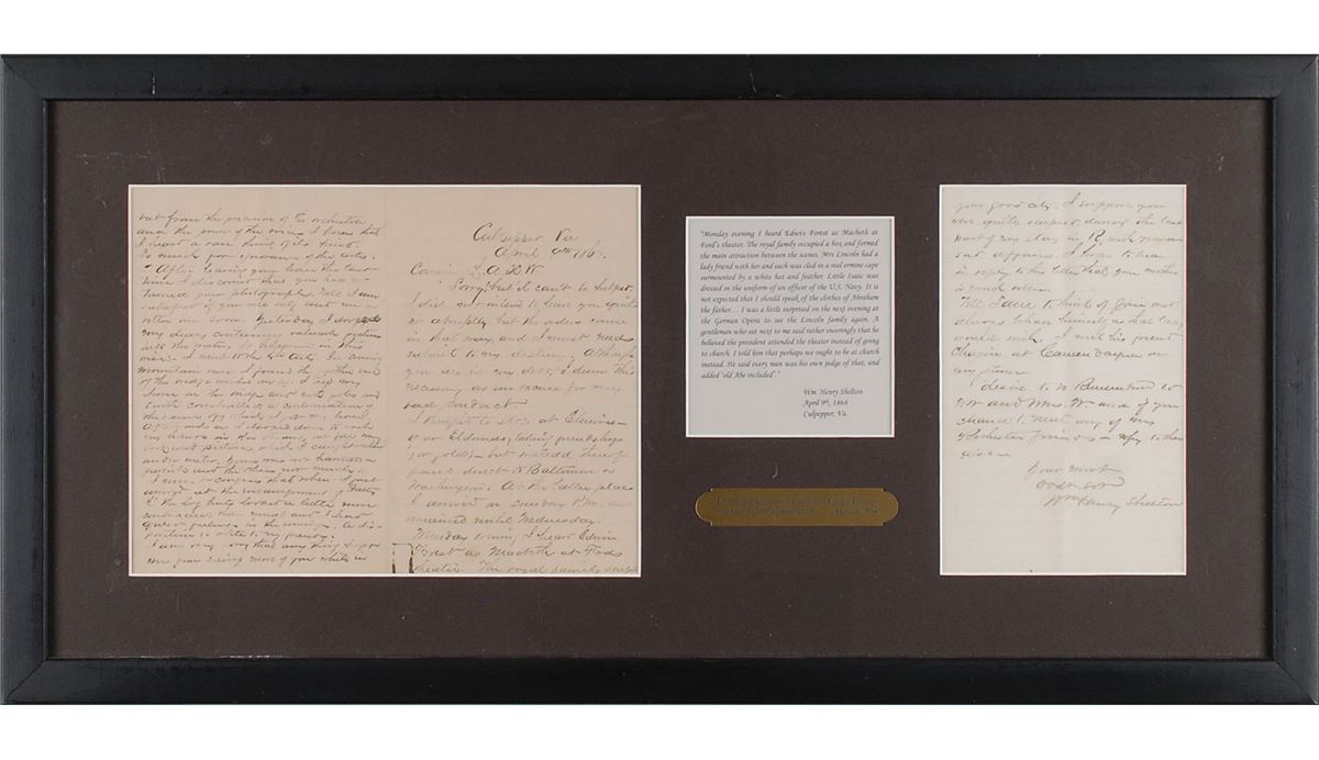 Civil War–dated ALS signed “Wm. Henry Shelton,” three pages both sides, 5 x 7.5, April 9, 1864. Letter describing an encounter with Lincoln at Ford’s Theatre. In part: “Monday evening I heard Edwin Forest as Macbeth at Ford’s theater. The royal family occupied a box and formed the main attraction between the scenes. Mrs. Lincoln had a lady friend with her and each was clad in a real ermine cape surmounted by a white hat and feather…It is not expected that I should speak of the clothes of Abraham the father…I was a little surprised on the next evening at the German Opera to see the Lincoln family again. A gentleman who sat next to me said rather sneeringly that he believed the president attended the theater instead of going to church. I told him that perhaps we ought to be at church instead. He said every man was his own judge of that, and added ‘old Abe included.’” Matted and framed with a plaque and partial transcription to an overall size of 26 x 13, with a window in the backing for viewing the reverse. In fine condition.