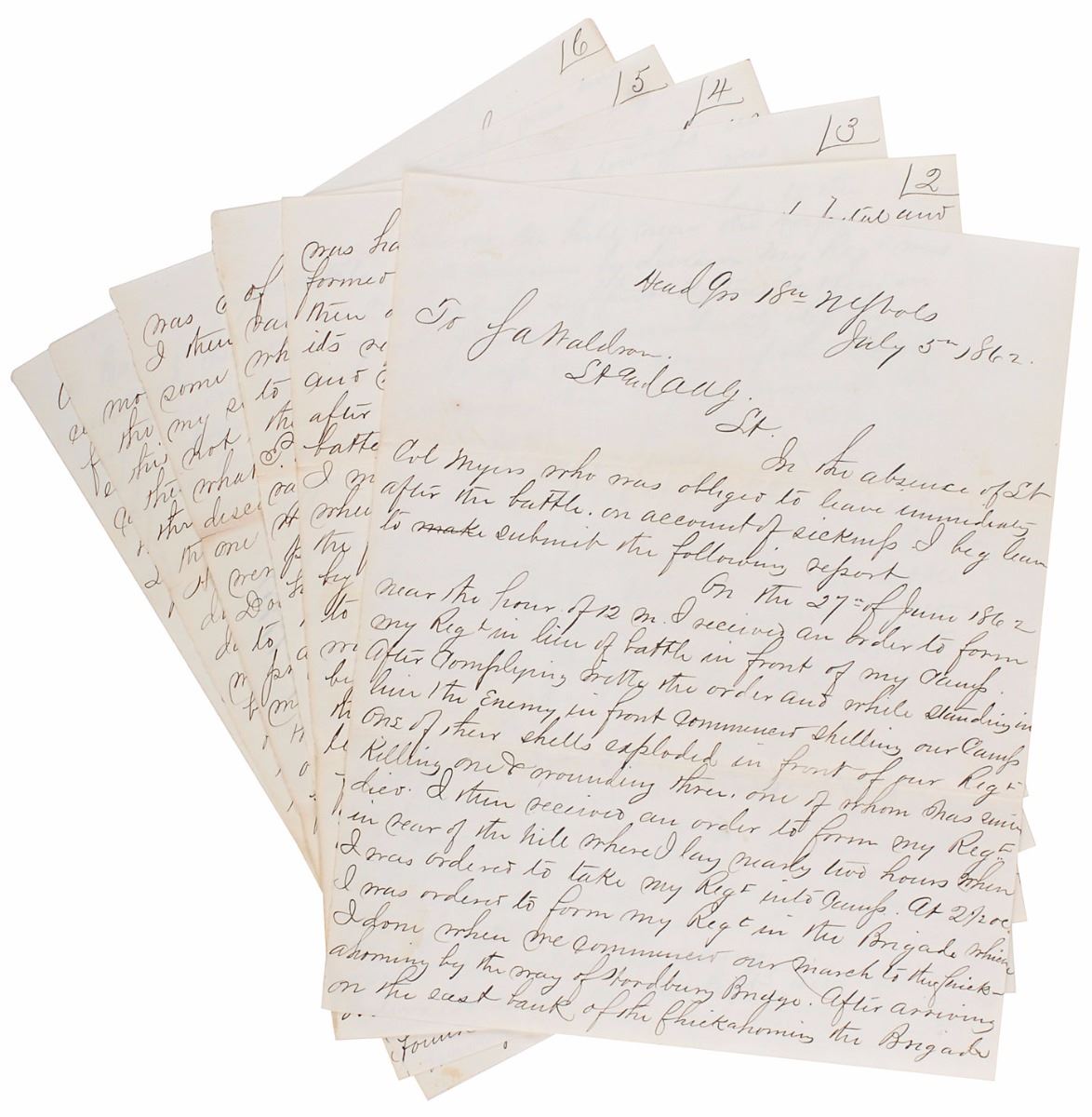 Manuscript copy of the report by Major John C. Meginnis of the 18th NY Vols on the Battle of Gaines Mill, six pages, lightly-lined, 8 x 10, July 5, 1862. In part: “Enemy in front commenced shelling our camp. One of the shells exploded in front of our regt…the battle was raging…our right companies received a terrific fire of grape and canister, the men lying down and receiving the fire with great coolness…discovered the enemy approaching in force…he remarked that ‘they were coming’ when he was hit by a rifle ball and killed instantly. I then gave the order to open fire…enemy had succeeded in turning our right flank…my men have expended all their ammunition…lost the most of our men…the 31st NYV poured a volley onto us from out rear.” In fine condition.
