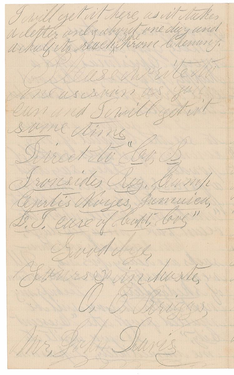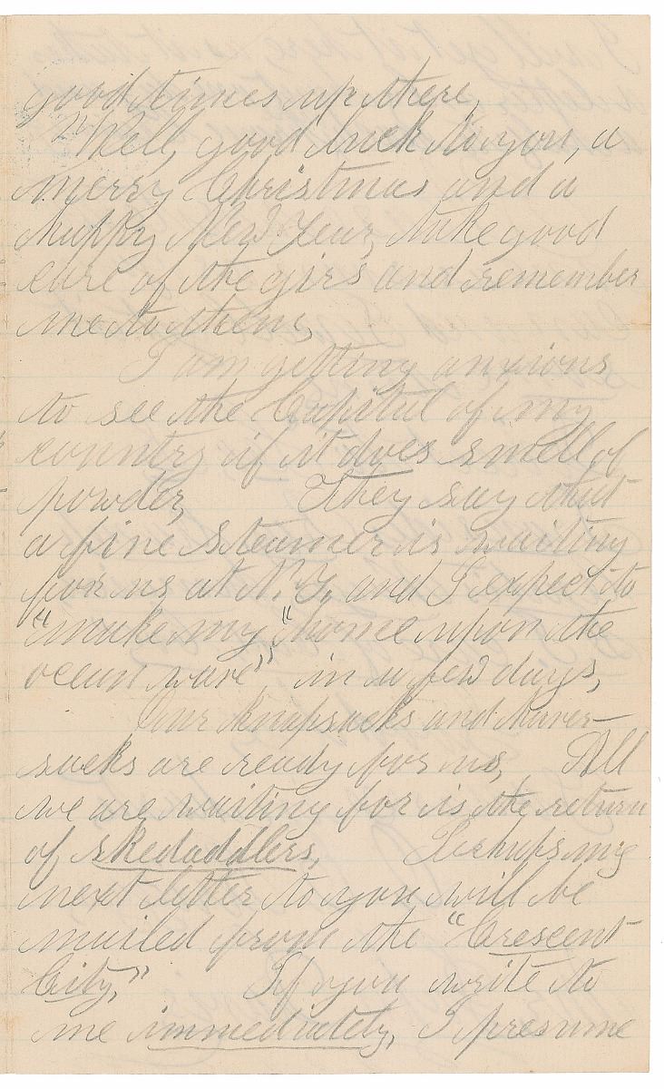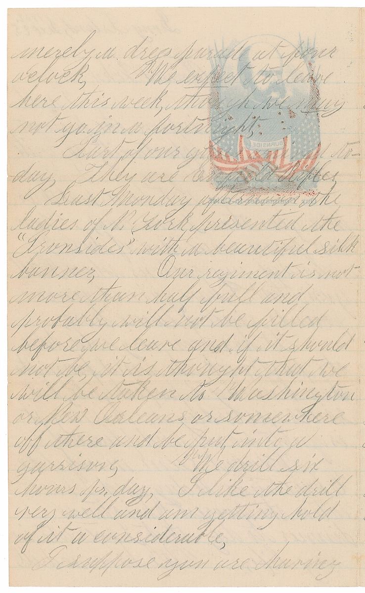 Civil War–dated ALS in pencil, signed “O. E. Briggs,” four pages on two adjoining sheets, 4.75 x 8, colorful patriotic Ambrose Burnside letterhead, December 25, 1862. Letter home to a friend. In part: “It doesn’t seem much like Christmas today and I have eaten the poorest Christmas dinner today that I have ever ate in my life…Part of our guns arrived today, they are Enfield rifles. Last Monday afternoon the ladies of N. York presented the ‘Ironsides’ with a beautiful silk banner. Our regiment is not more than half full and probably will not be filled before we leave and if it should not be, it is thought that we will be taken to Washington or New Orleans…I am getting anxious to see the capitol of my country even if it does smell of powder.” In fine condition, with some writing a couple shades light.