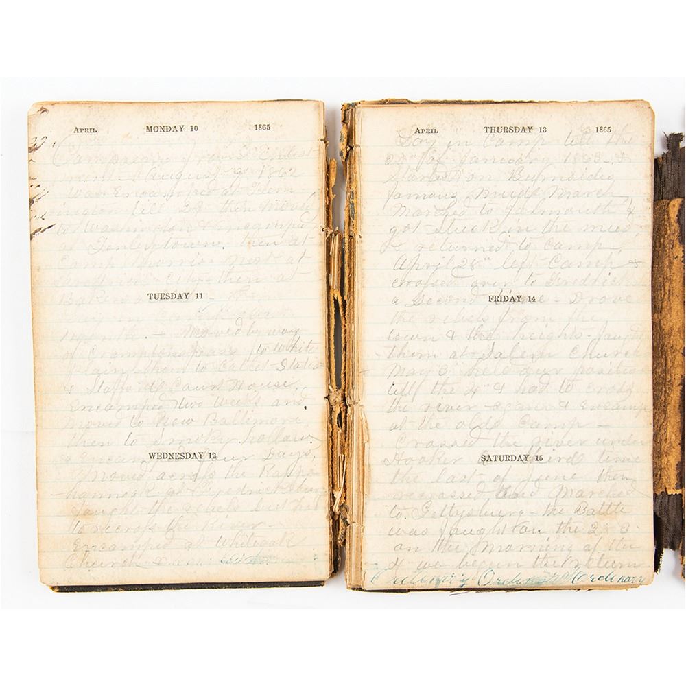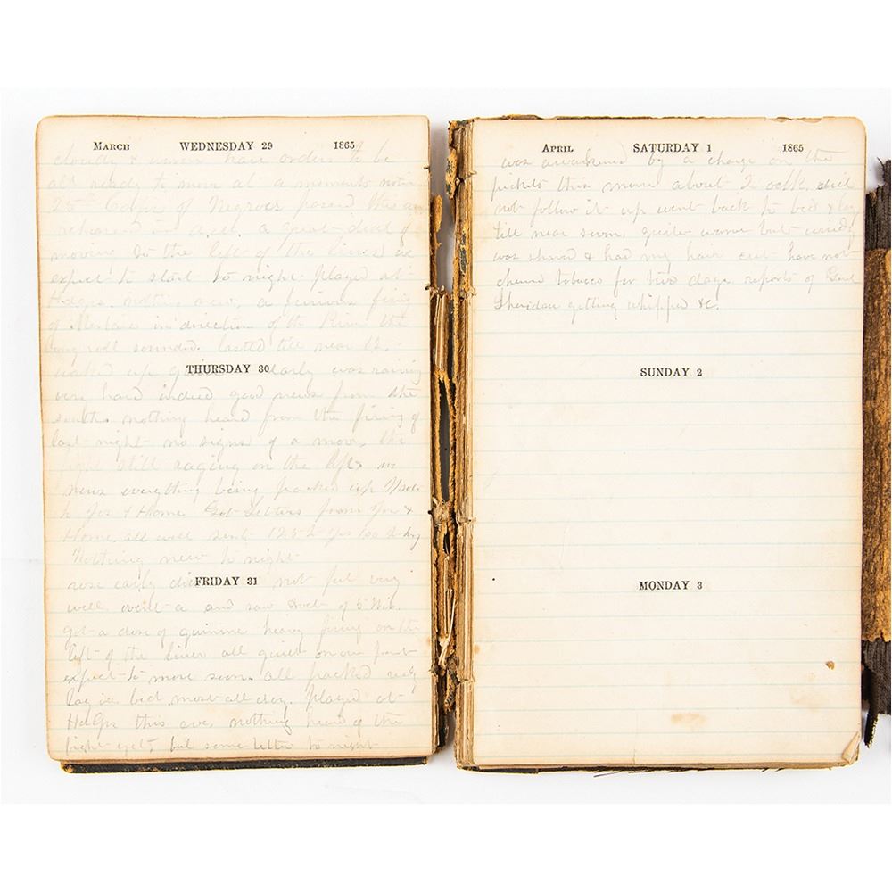 Unusual 'battlefield pick-up' Civil War-era diary containing entries from two different Union soldiers, Bandsman Hollis J. Haven of the U.S. Brigade Band and Private John Brisk Rush of Company H, 15th New Jersey Volunteers. The diary begins on January 1, 1865, with about 30 pages of Haven's daily entries, chronicling rehearsals, parades, picket attacks, weather conditions, deserters, and a surprising visit from superiors on March 25th: "Presdt. Lincoln & Genl. Grant was here, rather an exciting day." The Massachusetts musician abruptly ends his portion of the diary on April 1, 1865, recording "Reports of Genl. Sheridan getting whipped &c." Haven, who survived another sixty years, may have lost the diary in the confusion of preparing to pursue Lee's fleeing army on April 2, 1865.