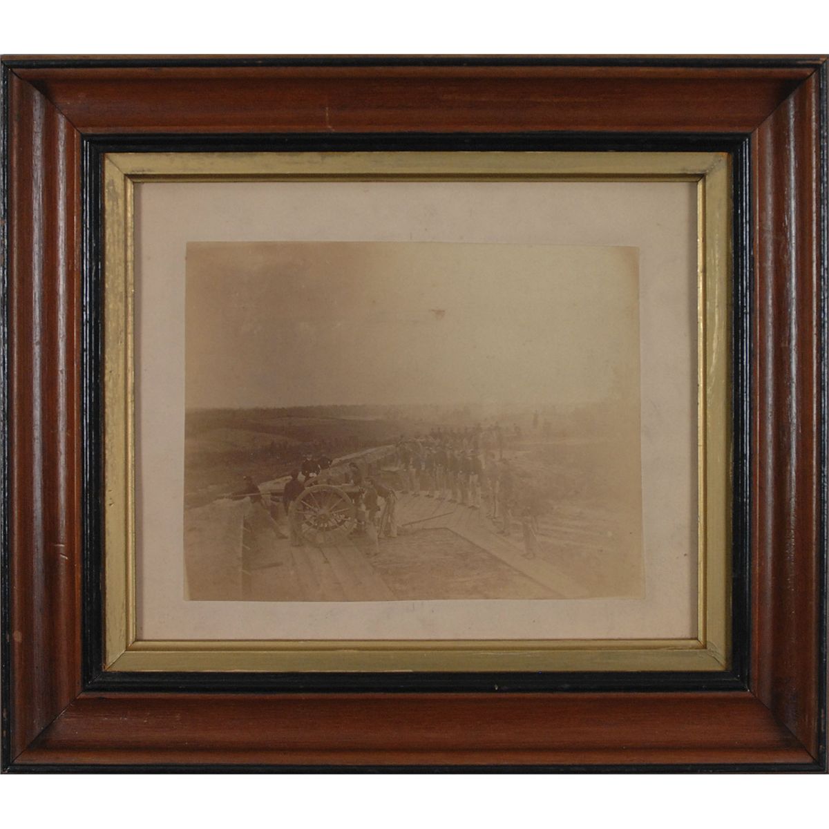 Original vintage photo, 8.5 x 6.75, affixed to a 10.5 x 8.5 mount, showing several Union cannons being manned by artillery soldiers, either at a fort or on high ground overlooking farmland, Framed to an overall size of 15.25 x 13.25. In very good condition, with a few spots and some fading to right side of image.