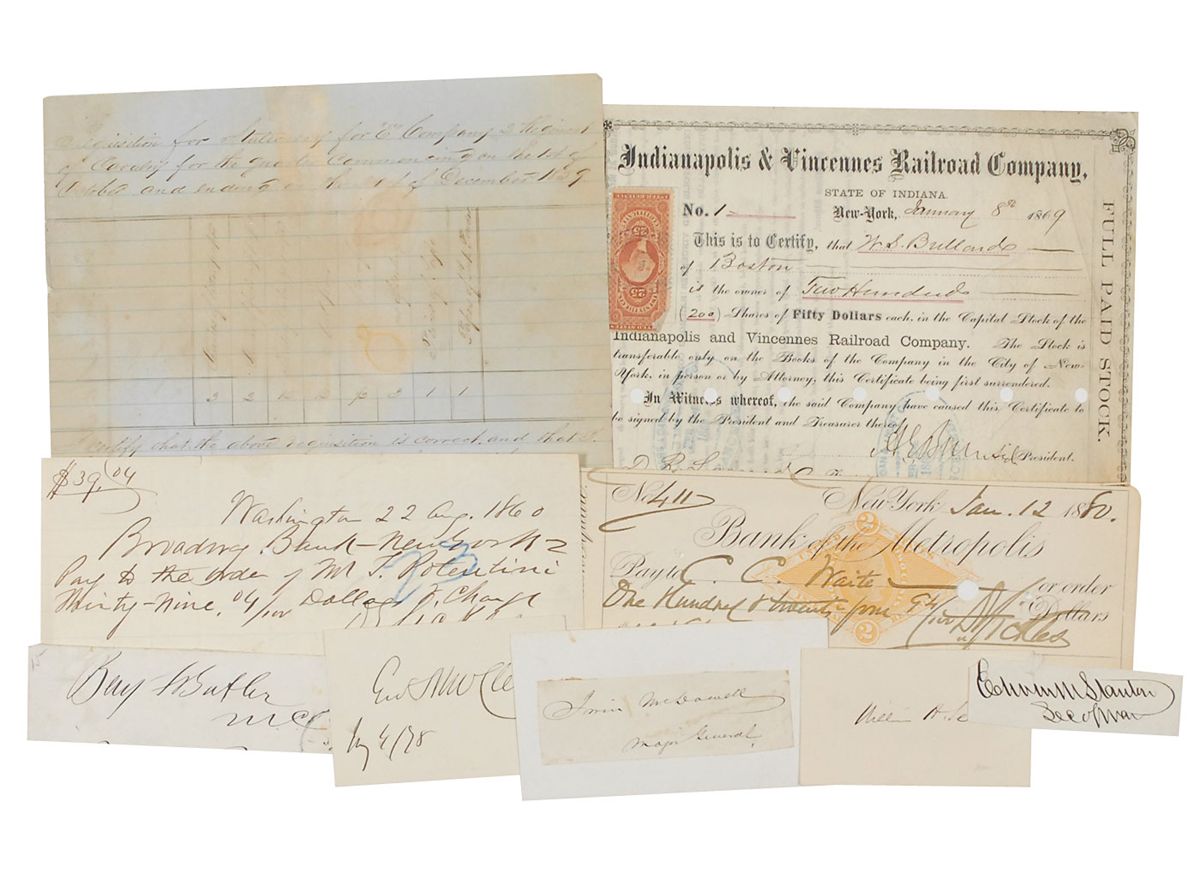 Collection of nine items, each signed by a prominent Union soldier or politician, including: Ambrose Burnside (DS), William H. Seward (signature), Edwin M. Stanton (signature), Daniel Sickles (two checks), George B. McLellan (signature), Irvin McDowell (signature), Benjamin Butler (clipped free frank), and George Stoneman (DS). In overall very good to fine condition. A diverse instant collection of the North’s finest leaders.
