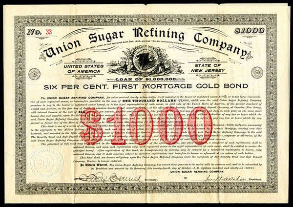 New Jersey. 1896. $1000 6% Issued and Uncancelled Bond. #33. State Seal top center. Black print with ornate black border and bond denomination in red. VF condition. Wm. F. Murphy's Sons Co.