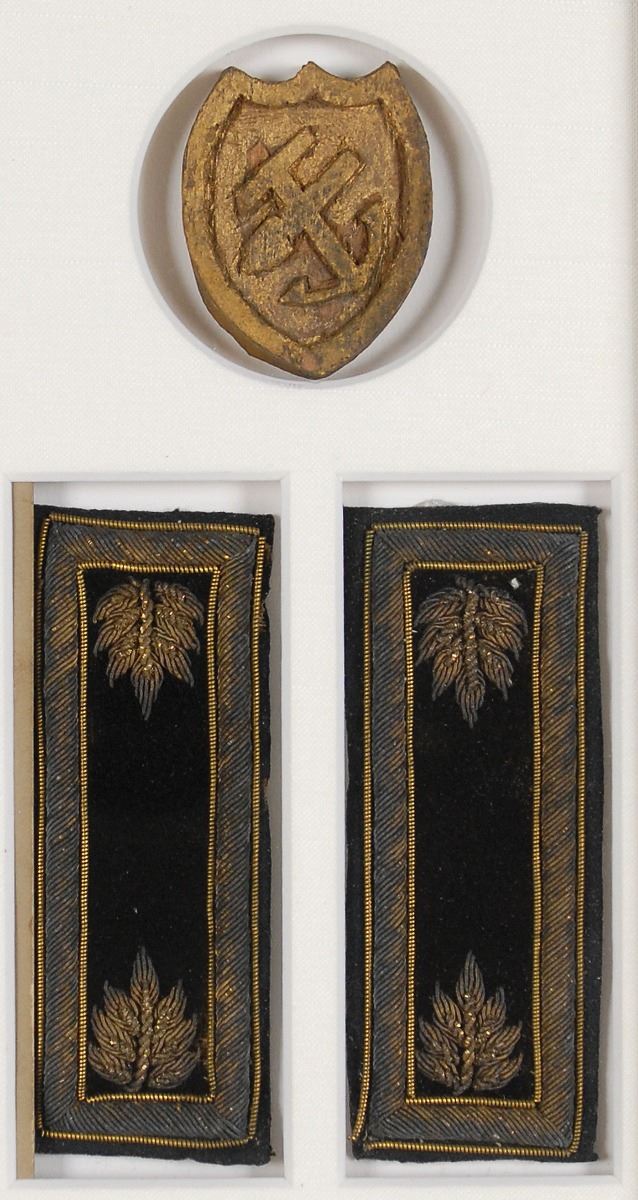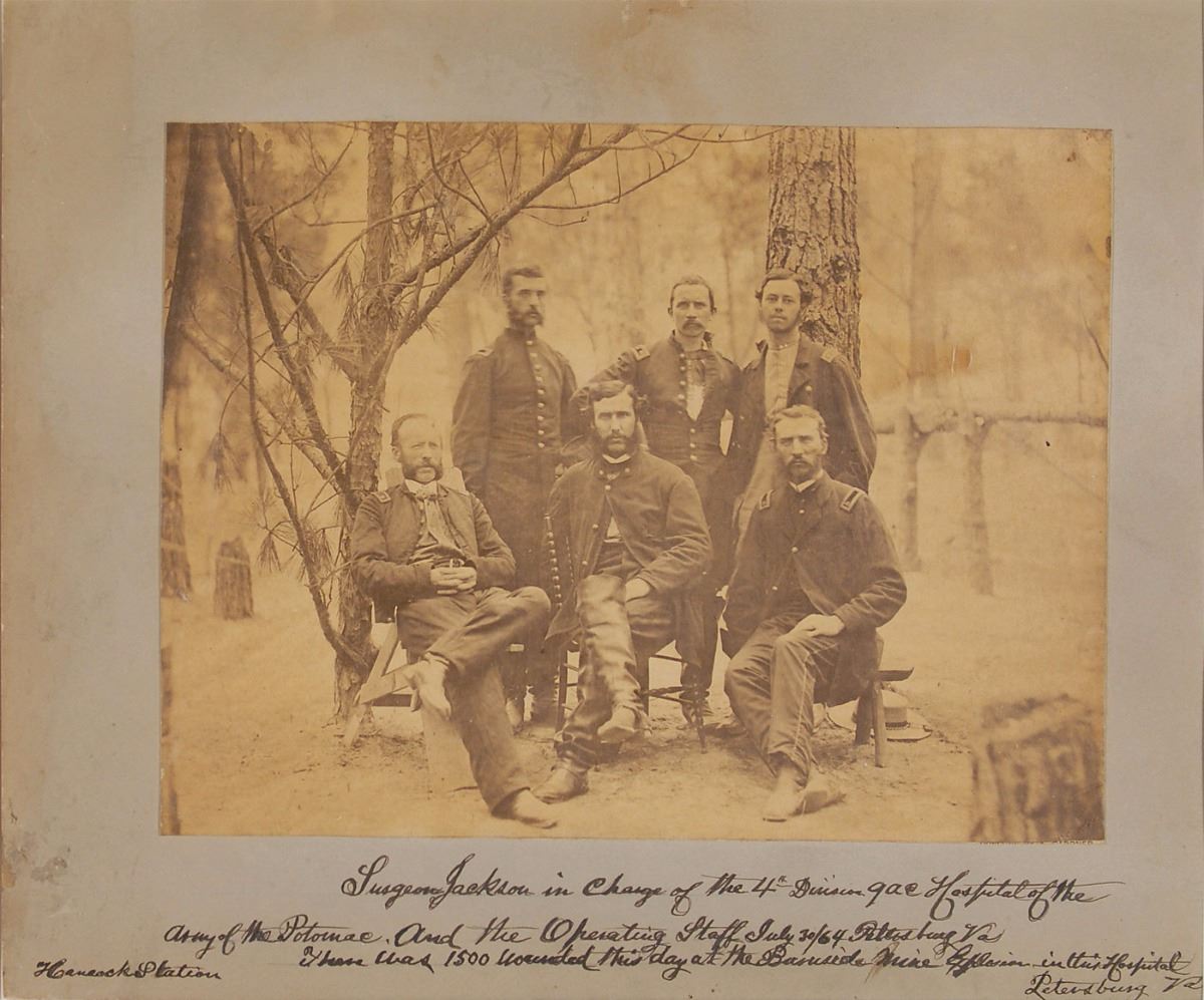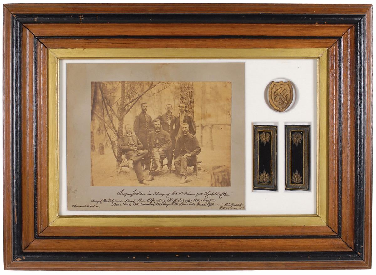 A mounted 9 x 6.75 photo of a group of Union surgeons, affixed to a 11.25 x 9.25 mount, identified in the lower border: “Surgeon Jackson in Charge of the 4th Division 9AC [9th Army Corps] Hospital of the Army of the Potomac. And the Operating Staff July 30/64 Petersburg Va. There was 1500 Wounded this day at the Burnside Mine Explosion in this Hospital, Hancock Station. Petersburg, Va.” Handsomely cloth-matted and framed with the two epaulets of Jackson’s major’s uniform and his hand-carved insignia to an overall size of 23.5 x 17. Scattered soiling to mount and the caption apparently originally done in pencil and traced over in bold black ink, otherwise fine condition. A label affixed to the backing of the frame noted that these items were found in the home of the granddaughters of Eben Jackson (seated on the right) in 1948, with a note that reads: ‘Eben Jackson was made Surgeon of the Colored Troops on Feb. 3, 1864 by Sec. of War.’ On July 30, 1864, in the Battle of the Crater and the day this photograph was taken, the Union Army exploded a mine, blowing a gap in the Confederate defenses of Petersburg, Virginia. An ill-prepared division led the assault and charged into the crater, where they became trapped; Gen. Robert E. Lee ordered his forces to go along the rim of the crater and open fire on the Union troops below. The disaster at the Battle of the Crater cost the Union 3,798 killed, wounded, and captured; the Union wounded went to Eben Jackson’s hospital.