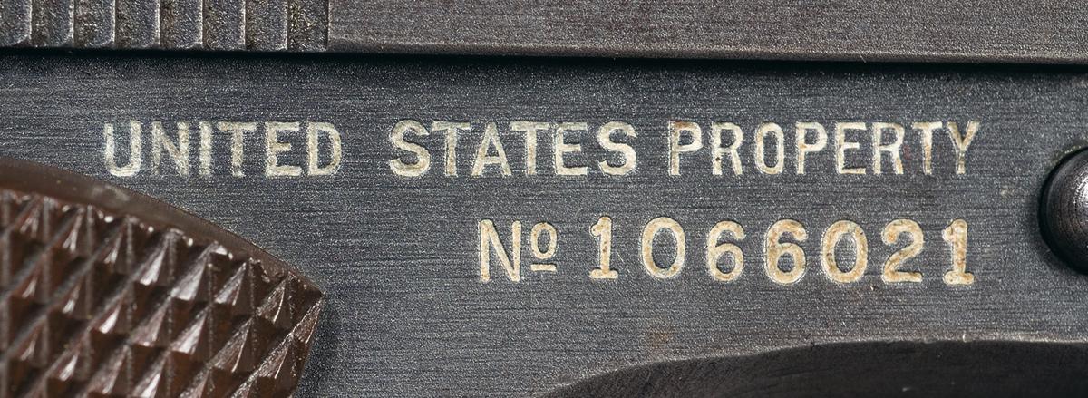 This Model 1911A1 Automatic Pistol was manufactured by the Union Switch & Signal Co., of Swissvale, Pennsylvania, in 1943. The pistol has a gray parkerized finish and is fitted with checkered brown plastic grips. The pistol has a narrow hammer with checkered spur, checkered main spring housing and safety lock, serrated slide stop and stamped trigger. The Keyes Fibre plastic grips have interior strengthening ribs but do not have reinforcing rings around the screw holes. The High Standard barrel is stamped "HS" on the right side of the lug and "P" on the left. The slide is, correctly, not stamped with the pistol serial number. The right side of the frame is roll-stamped: "UNITED STATES PROPERTY/No1066021" in two lines behind the slide stop hole and "M 1911 A1 U.S.ARMY" in front of it. A "P" proofmark is stamped on the left side of the frame below and behind the magazine release. The Ordnance final inspection mark with the initials "R.C.D." surrounded by a circle is stamped below the slide stop cut-out. The left side of the slide is roll-stamped with the "USS" logo followed by the two-line legend "U.S. & S. CO./SWISSVALE, PA. U.S.A.". A "P" proofmark is stamped on the upper left side of the slide between the ejection port and the rear sight. The "P" faces the ejection port.