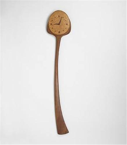 Union Woodworking wall clock USA, 1980 walnut, bird's-eye maple, balsa wood 13.5"w x 68.5"d x 2.5"h Signed to verso: [Union Woodworking Northfield NJ 1980].