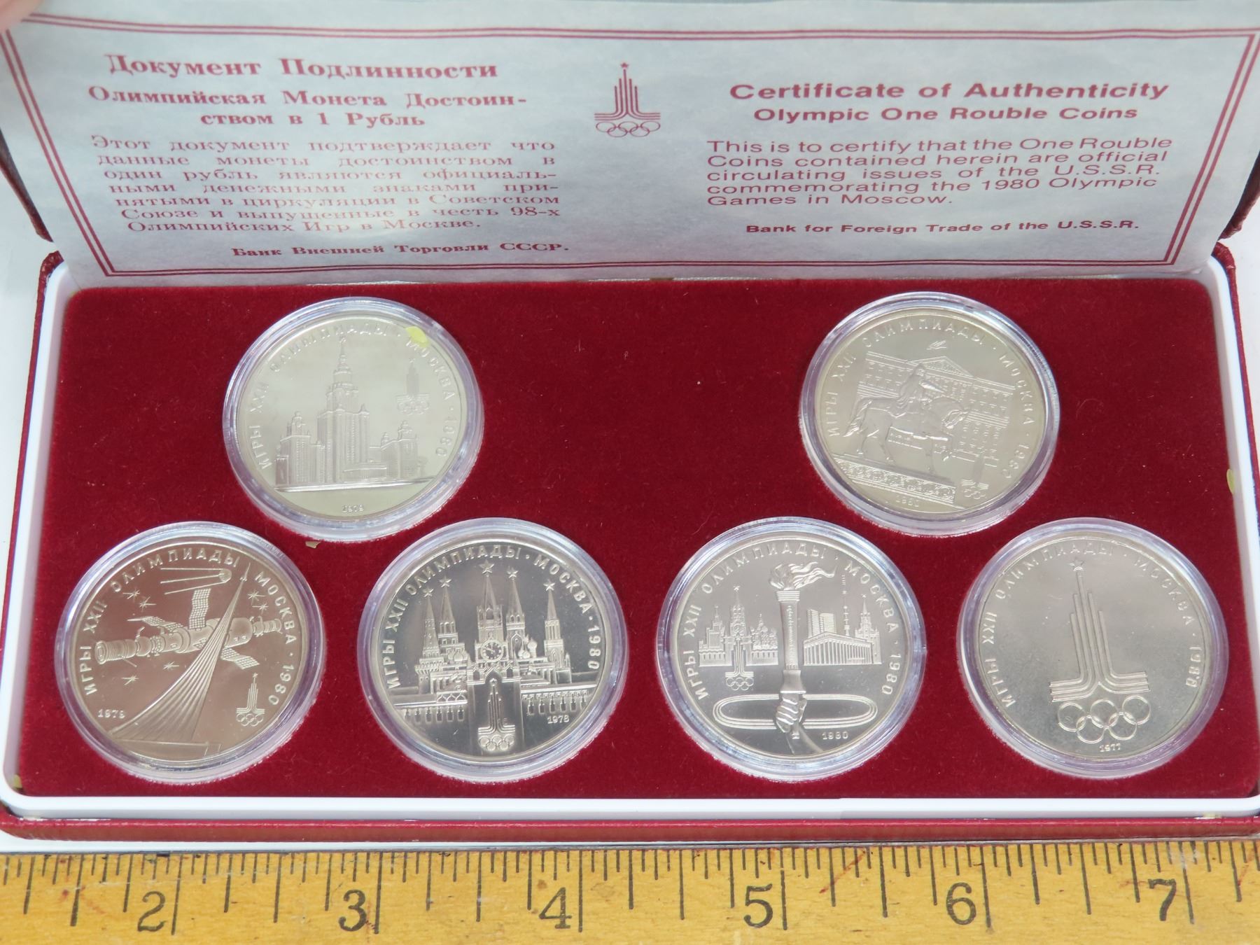 Union of Soviet Socialist Republics (USSR) 1980 Moscow Olympic Games one rouble coins. 6 one-rouble coins housed in original case of issue.
