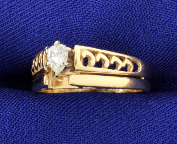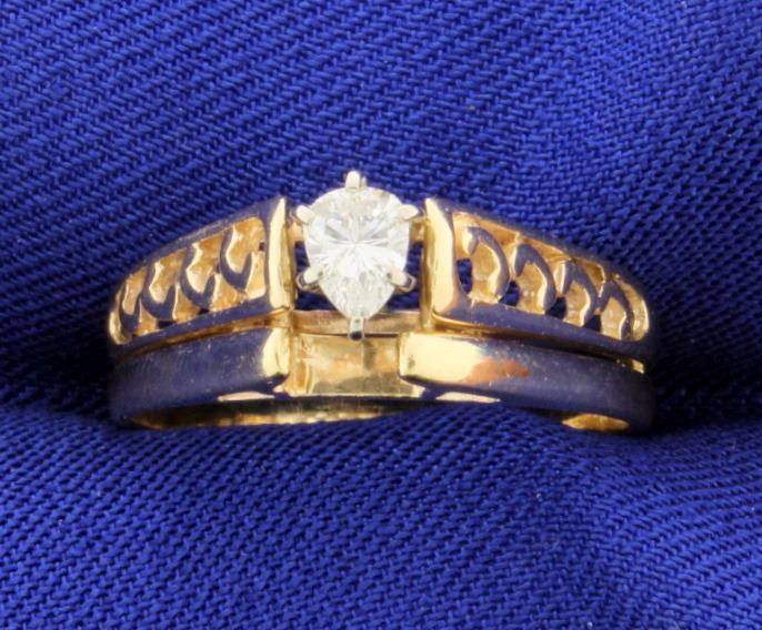 In 14k yellow gold. Contains a high quality 1/4 carat pear shaped diamond I, SI1 clarity and H color. The engagement and wedding bands are currently soldered together, but can be separated. Size 7.5. 3.7g