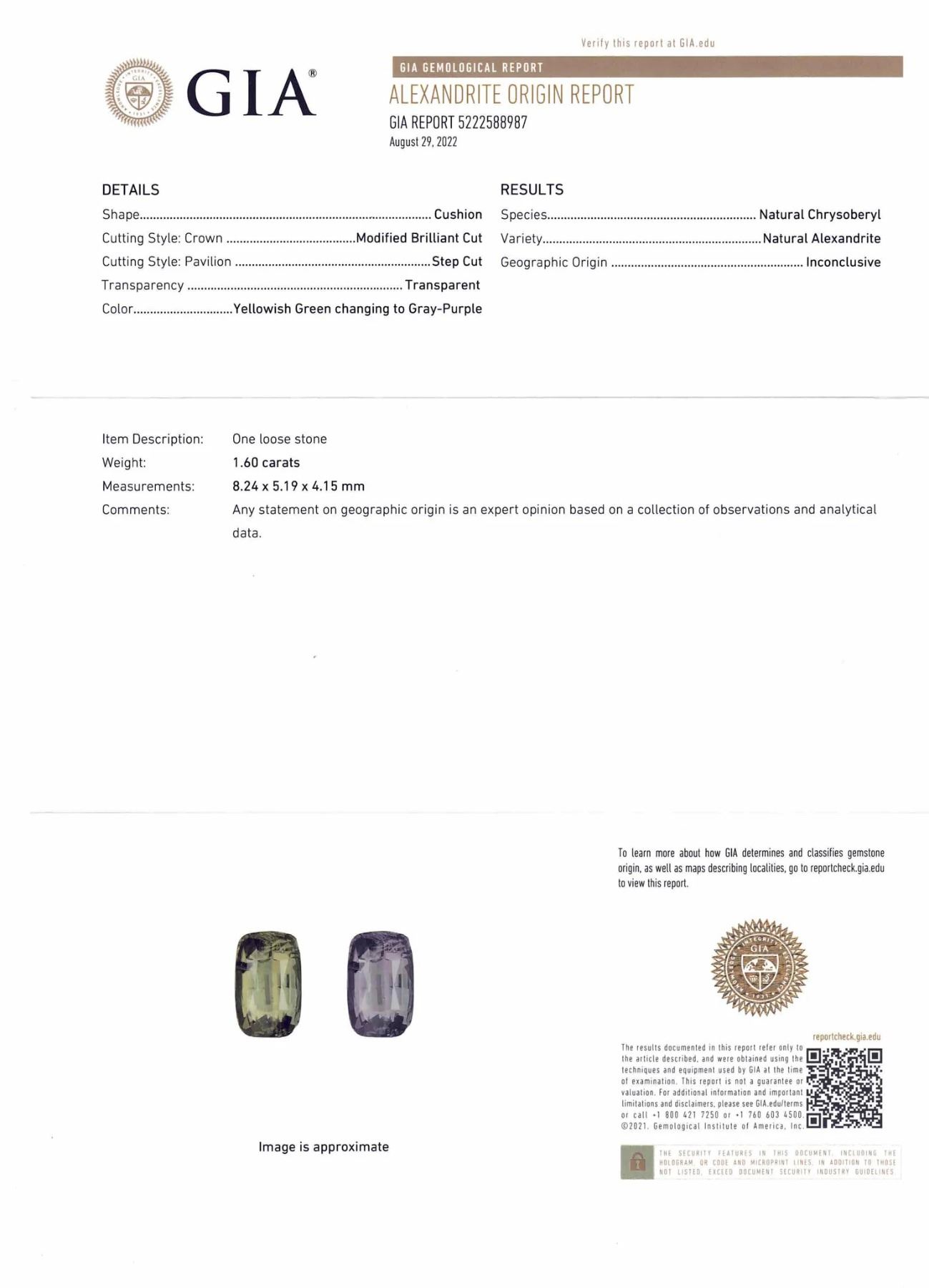 Rare 1.6 Ct Yellowish Green to Gray-Purple Color-Changing Alexandrite is a cushion brilliant cut measuring 8.24 x 5.19 x 4.15 mm. Reveals an amazing hue with a medium dark tone. You do not want to miss this one! Treatment: None. Please see the certification for additional information.