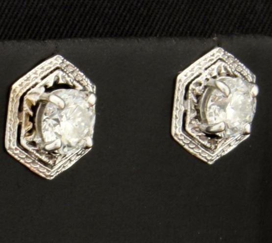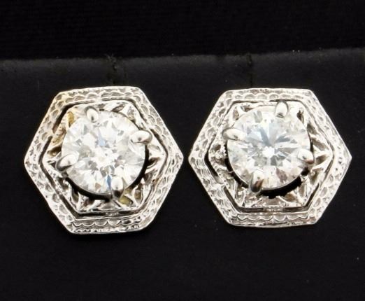 In 14K white gold, diamonds have a ton of life and sparke and are H color, I1 clarity. 1/2 inch long. With friction backs. 2.2g