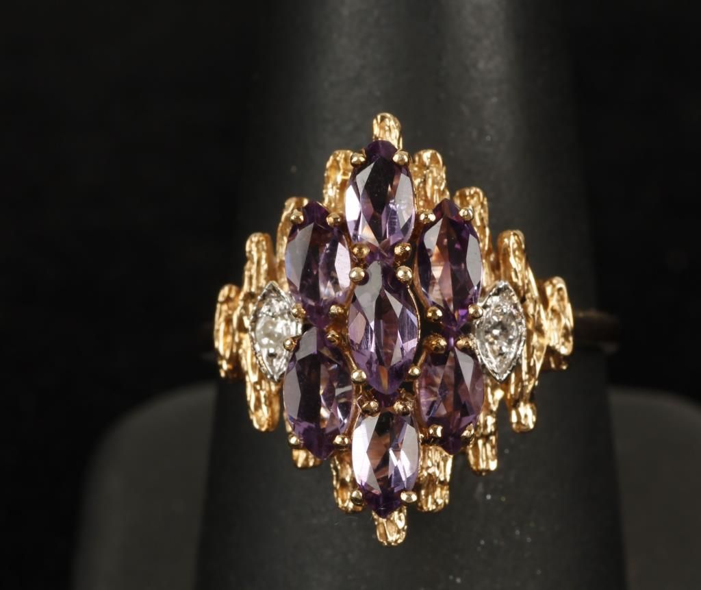 The ring features 7 marquise amethyst totaling about 2.4 cttw, they are accented by 2 small diamonds, and all are set in 10K yellow gold with a bark finish. The ring is size 8.5 and weighs 4 grams.