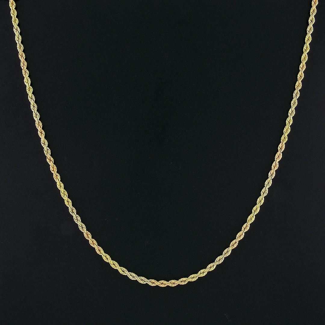 A solid 14k yellow, rose & White Gold rope link chain necklace. It weighs a total of 12.88 grams, measures 3.2mm wide, and measures 15.5 inches in length.