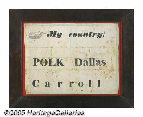 <B>Unique 1844 Polk and Dallas Silk Flag</B></I> Measures 11" x 14 1/2", comprised of three white horizontal panels sewn together with a light teal border applied on three sides (top, bottom and right). Stenciled decoration and inscription shows a pointing hand and the wording "My Country! Polk Dallas Carroll." James Carroll (1791-1893) was the unsuccessful Democratic candidate for Governor of Maryland in 1844. Two small holes and light stains; generally well-preserved. Nicely framed, floating against a red felt background. Polk textiles are prohibitively rare. This example has some fine "folk art" design elements. Lot:256