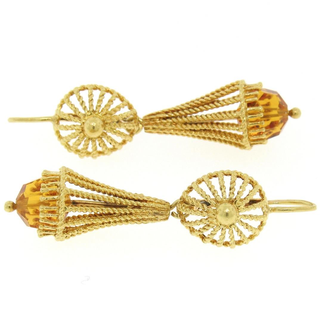 One Unique 18K Yellow Gold Open Twisted Wire Dangle Citrine Bead Lever Back Earrings. Item Details: Material: 18K Solid Yellow Gold , Weight: 9.8 Grams, Stone(s): (2) Natural Genuine Citrine - Faceted Bead Cut - Post Set - Rich Yellow-Orange Color - 8.0x7.83mm / 6.50ctw (approx.), Backing: Lever Backings (pierced ears required), Width: 11.75mm (top part), 11mm (bottom part), Overall Height: 46.0mm, Thickness: 7.2mm projection off the ear (top part), Dangle Length: 27.9mm Condition: Excellent condition!