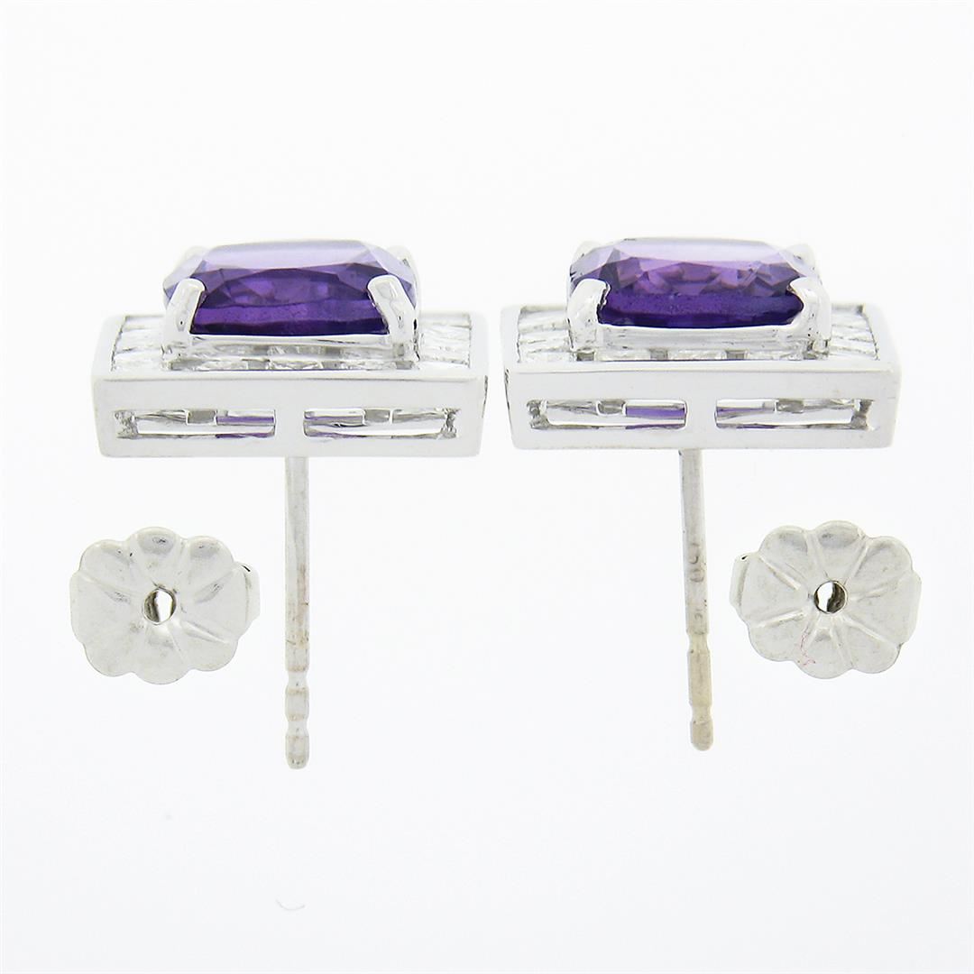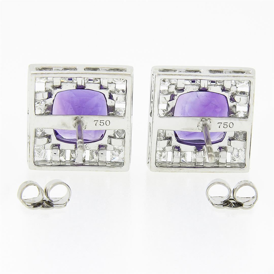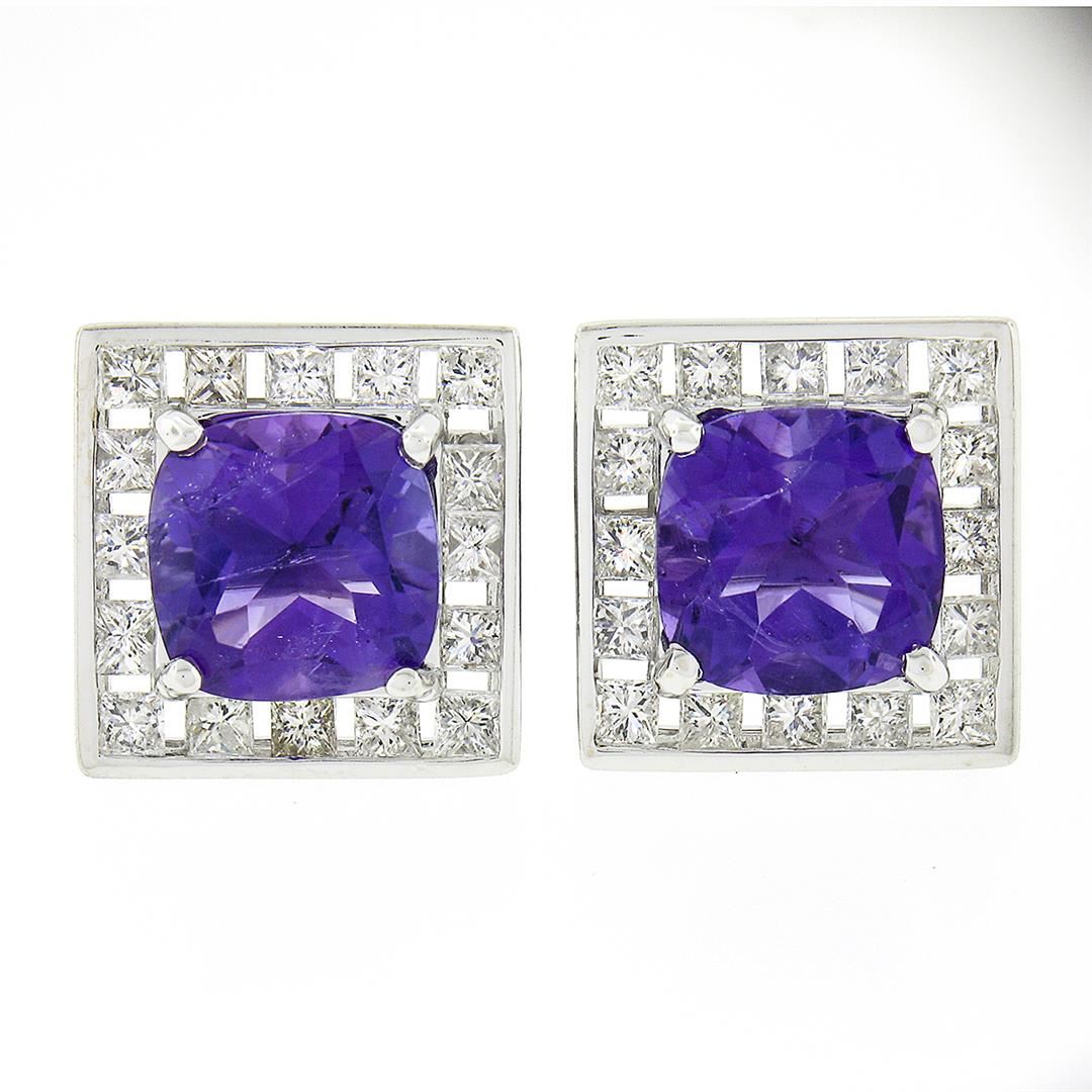 A solid 18k white gold stud earrings, with 2 cushion cut natural amethysts (8.15x8.15mm each - 3.60ctw), and 32 princess cut natural diamonds (H/I - VS2-SI1 ; 1.0ctw). The earrings measure approximately 12.90x12.65mm and weigh a total of 5.30 grams.