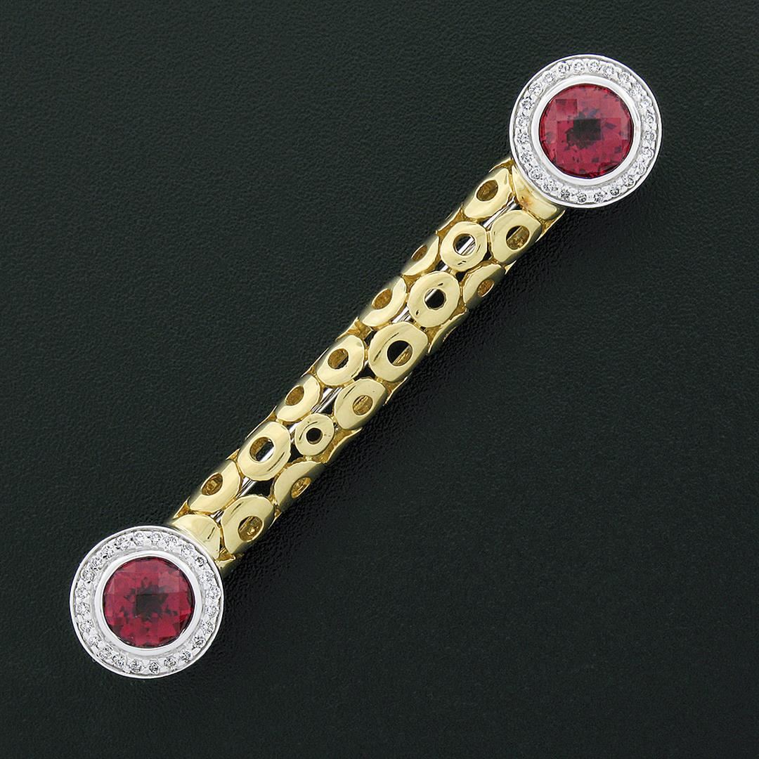 A solid 18k yellow and white gold bar pin brooch, with 2 round checkerboard natural tourmaline (3.50ctw), and 48 round brilliant cut natural diamonds (F/G - VS1/VS2 ; 0.50ctw). Measures 61.10x11.80mm and weighs a total of 13.11 grams.