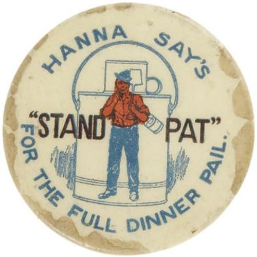 <B>Unique 1900 McKinley Campaign Pin.</B></I> 1 1/4" pin from McKinley's reelection campaign is a rarely seen example of his "Dinner Pail" slogan. The pin features a working class gentleman surrounded by "<I>HANNA SAY'S [sic] GÇÿSTAND PAT' FOR THE FULL DINNER PAIL."</B></I> Though this pin features some nicks, it is a charming example of McKinley's populist advertising.<BR><BR><b>Shipping:</b> Miscellaneous Collectibles, Smal (<a target="_blank" href="http://www.heritageauctions.com/common/shipping.php">view shipping information</a>)