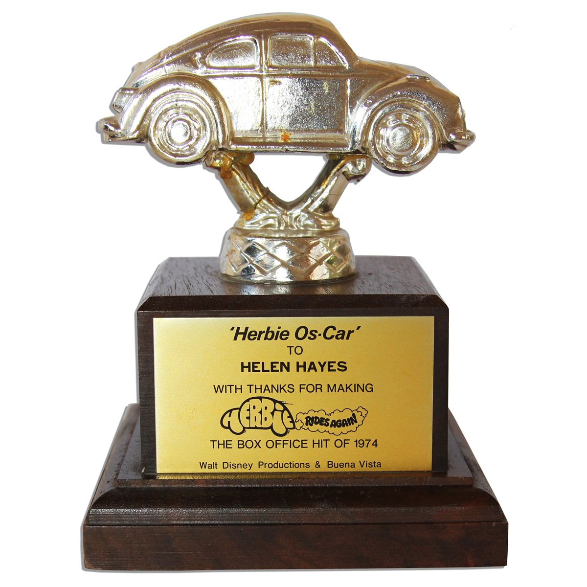 Hollywood legend Helen Hayes' ''Herbie Os-Car'' award from Disney. Wood and metal trophy honors Hayes for her role in ''Herbie Rides Again,'' the sequel to the hit Disney film ''The Love Bug'' about a Volkswagen Beetle named Herbie that comes to life. Hayes counted this award among her others as one of just eleven people ever to win an Emmy, Grammy, Oscar and Tony. Hayes was also the recipient of the National Medal of Arts and Presidential Medal of Freedom. Charming trophy is a metal VW bug held aloft atop a wooden base. Plaque to the front of base reads cleverly: '''Herbie Os-Car' / To / Helen Hayes / with Thanks For Making / Herbie Rides Again / The Box Office Hit of 1974 / Walt Disney Productions & Buena Vista''. Measures 5.5'' in total height; base measures 4'' x 4''. With expert repair to the left prong under car and rubbing to left front corner of base, else near fine. A charming award from one of the most respected and merited actresses in Hollywood history. From the Helen Hayes Estate.