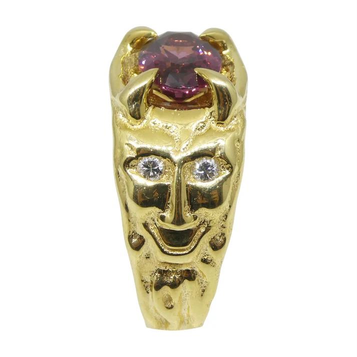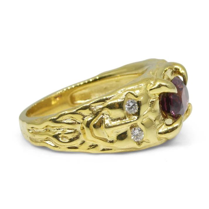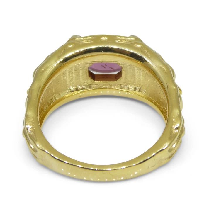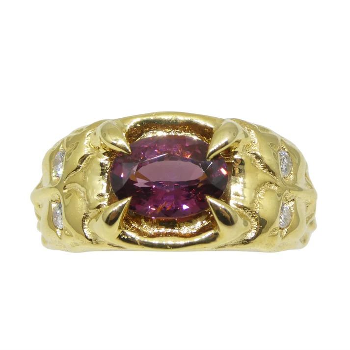 Impressive 2.11 Ct Pink Spinel is an oval brilliant cut measuring 9.12 x 6.92 x 4.51 mm. This investment-grade spinel is set in 14k Yellow Gold and is accented with natural diamond accent stones. It reveals a medium dark tone with strong saturation. Get ready for the compliments on this one!!! The ring is currently a size 8.75, it can be resized for free after purchase. Origin: Sri Lanka. Total Weight of Item: 13.32g.