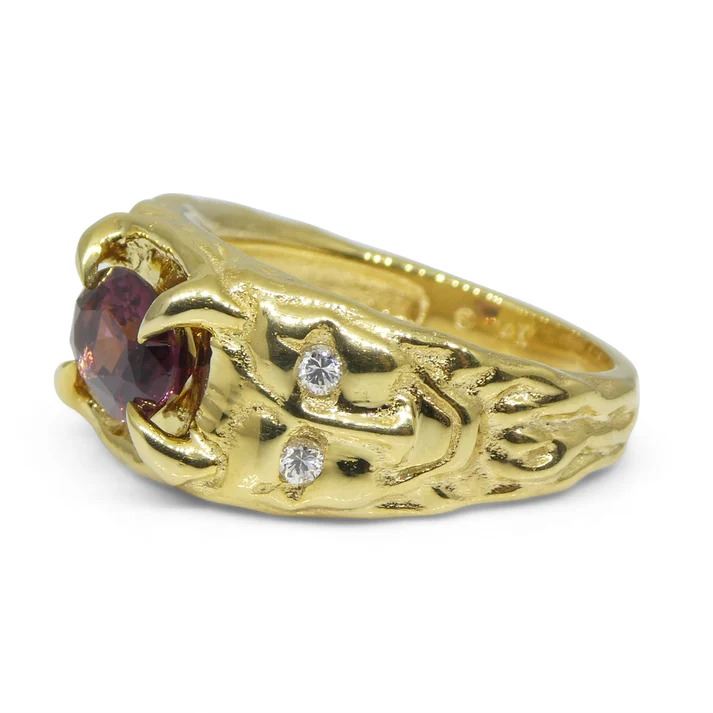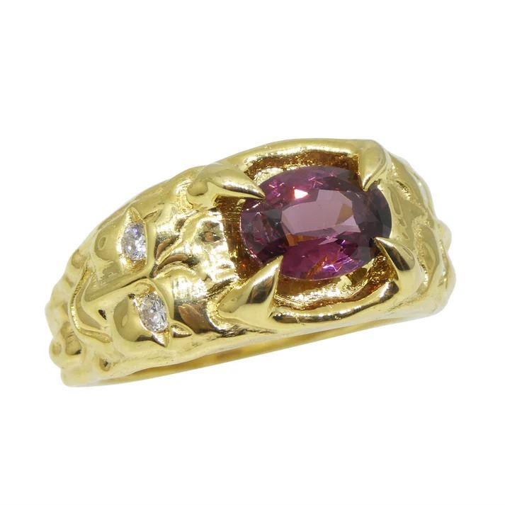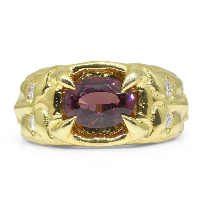 Impressive 2.11 Ct Pink Spinel is an oval brilliant cut measuring 9.12 x 6.92 x 4.51 mm. This investment-grade spinel is set in 14k Yellow Gold and is accented with natural diamond accent stones. It reveals a medium dark tone with strong saturation. Get ready for the compliments on this one!!! The ring is currently a size 8.75, it can be resized for free after purchase. Origin: Sri Lanka. Total Weight of Item: 13.32g.