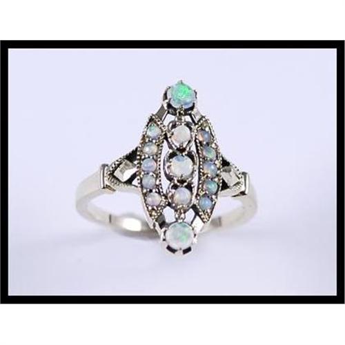 Unique ring with 15 round cut opals set in 9K yellow gold. The size 6-3/4 ring measures 19.7 millimeters (0.78 inches) x 9.4 millimeters (0.37 inches) and weighs 2.80 grams total weight.