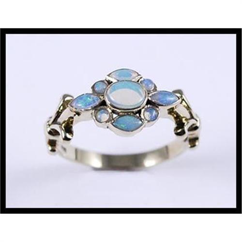 Unique ring with 1 oval cut, 4 round cut, and 4 marquee shaped opals set in 9K yellow gold. The size 6-3/4 ring measures 9.4 millimeters (0.37 inches) wide and weighs 2.40 grams total weight.