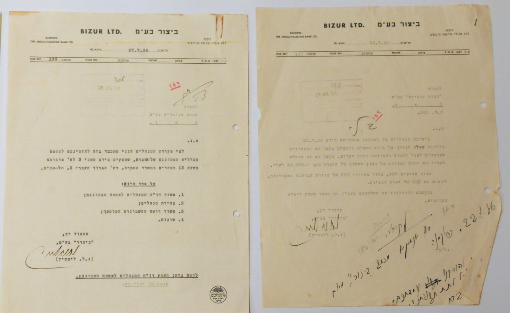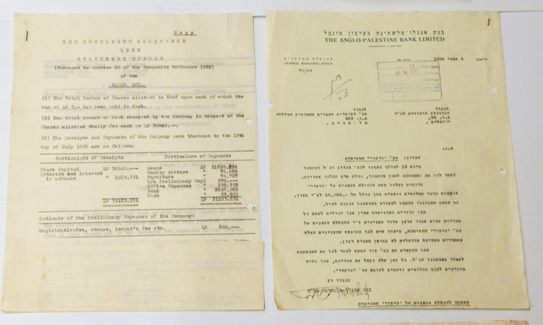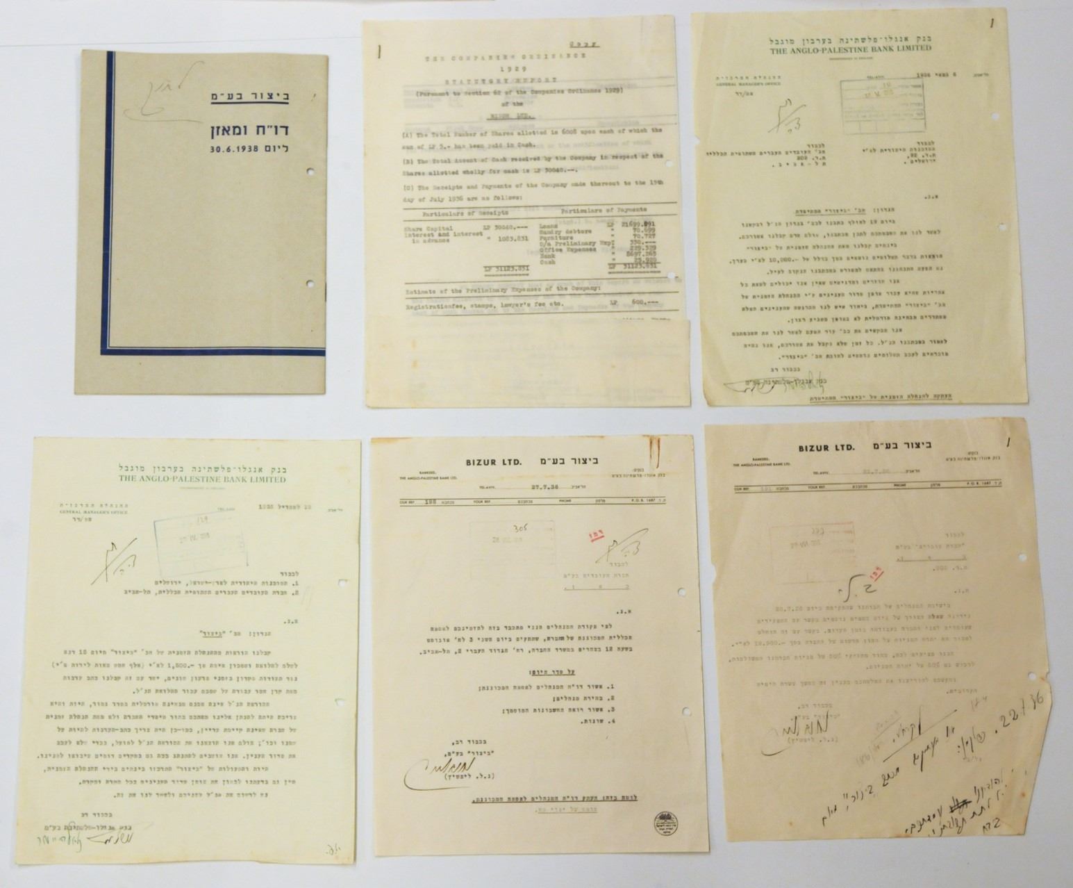 Unique! A collection of documents related to Bitzur Ltd., includes two sample shares submitted to the Anglo-Palestine Bank and letters from the bank responding to these samples, 2 company letters dated 1936, which contain an invitation to a meeting and a letter to the company shareholders regarding the issue of additional company shares, executive summary from 1929 in English, and a balance report from June 30, 1938.