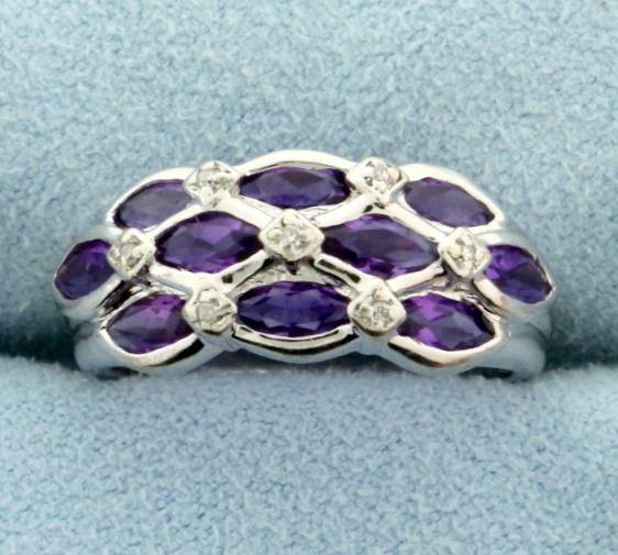 In 10k white gold. Contains ten .25ct natural purple amethyst gemstones with deep purple color and excellent clarity. Also contains seven high quality .005ct diamonds. Size 6. 2.9g.