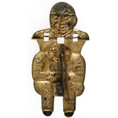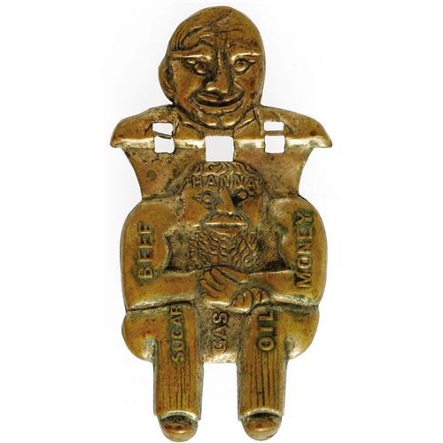 <B>Unique Anti-McKinley Brass Shell Pin.</B></I> We have never seen another example of this variety, which shows McKinley, wearing a distinctly distressed expression, standing behind a figure in a miserly crouch, marked "Hanna" on his forehead. Raised letters on the Hanna figure read "Beef", "Sugar", "Gas", and "Oil" (all trusts villified by the Bryan campaign) and "Money". The Hanna is of course Mark Hanna, McKinley's political mentor. Among other things, Hanna's detractors accused him of being the puppet-master of a candidate who was the tool of "Big Business" Republicans. <BR><BR>Clearly something is missing from this piece, which fit into the slots across the chest. Probably these were McKinley's arms, although we can only speculate as to how they may have moved. Original pin on reverse. <I>From the Norman Loewenstern Collection.</B></I>