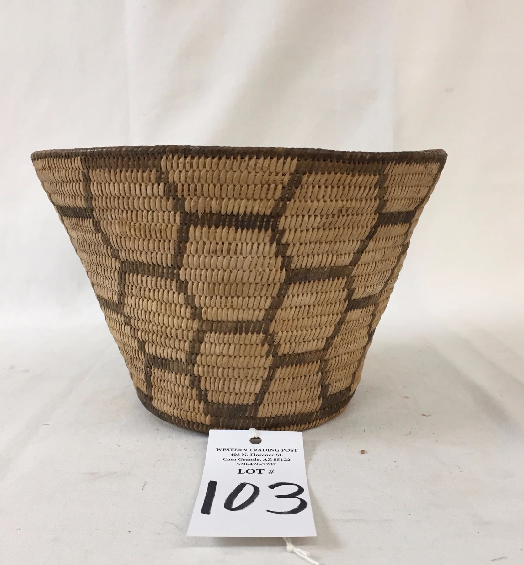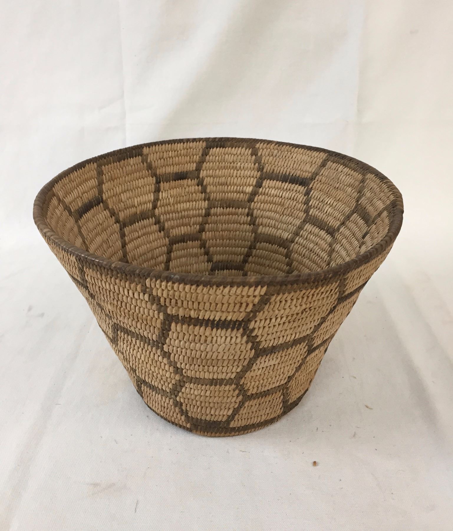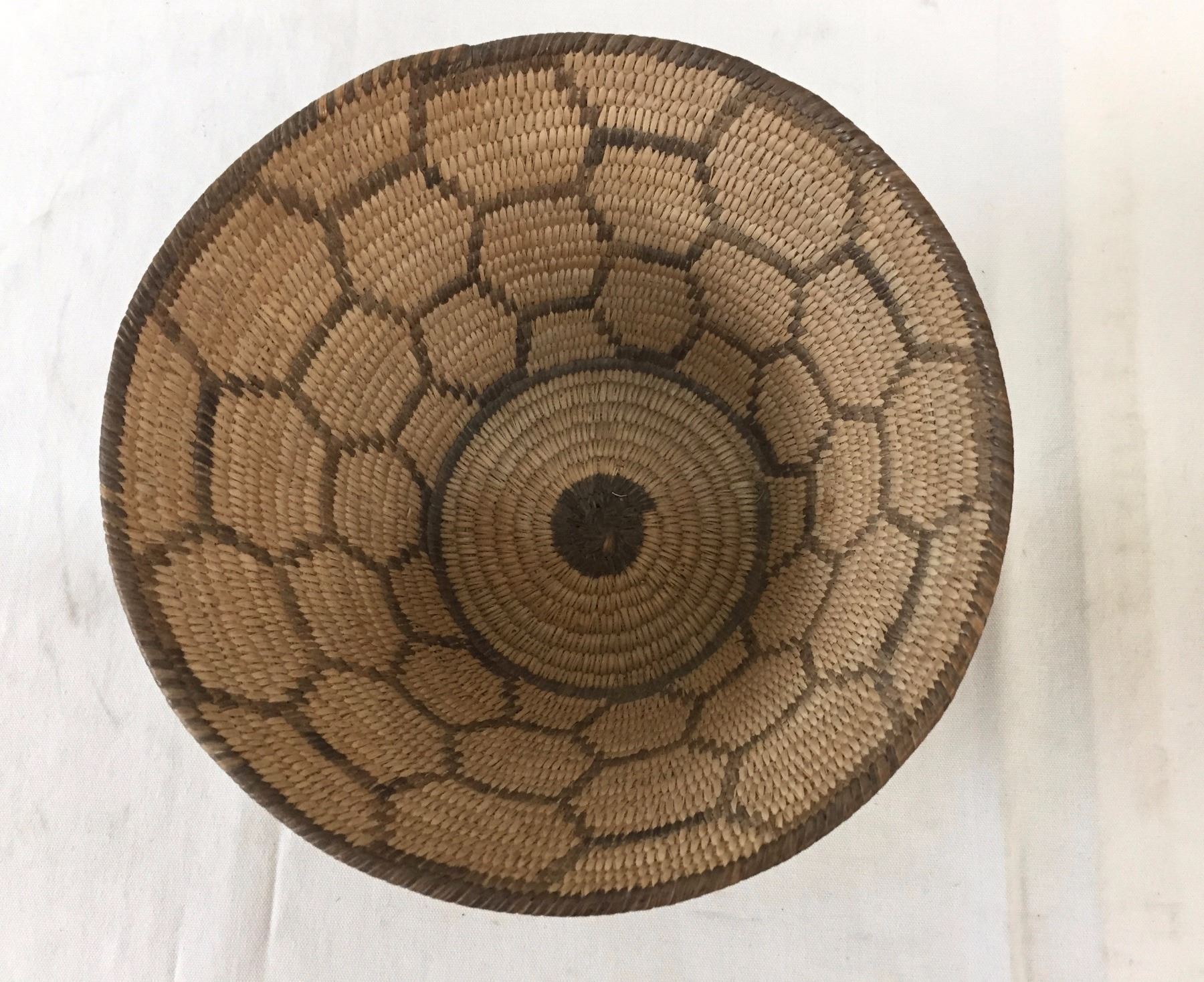 Description: A unique, antique pima basket with kind of a honeycomb looking design. Maker: Unknown Pima Artist. Approx. Age: Circa early 1900s. Size: 9-1/2”w x 6-1/4” tall. Condition: Pretty good for its age, normal wear and fading expected. Please look closely at the pictures - they are an important part of our description. Shipping: There will be a $7 handling / packaging fee for shipping this lot. The actual cost of postage will be added on top of that.