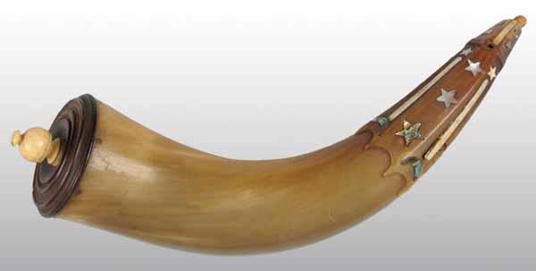 Description Faceted spout inlaid with "sea-shell" stairs and small half moons, very finely turned end-plug, and a "bone" screw-out on the end-plug. Condition (Very Good). Size 12" L.