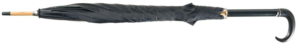 Fine as restored. The umbrella is very good, with some mild handling marks overall and some finish loss on the handle. The crook is fair with cracks forming near the wrist and a metal reinforcing band added to the area. 80% of the nickel finish remains on the revolver with some flaking and dings. The cylinder pin has been modified and may have once served as the base for a small dagger. Mechanically fine.