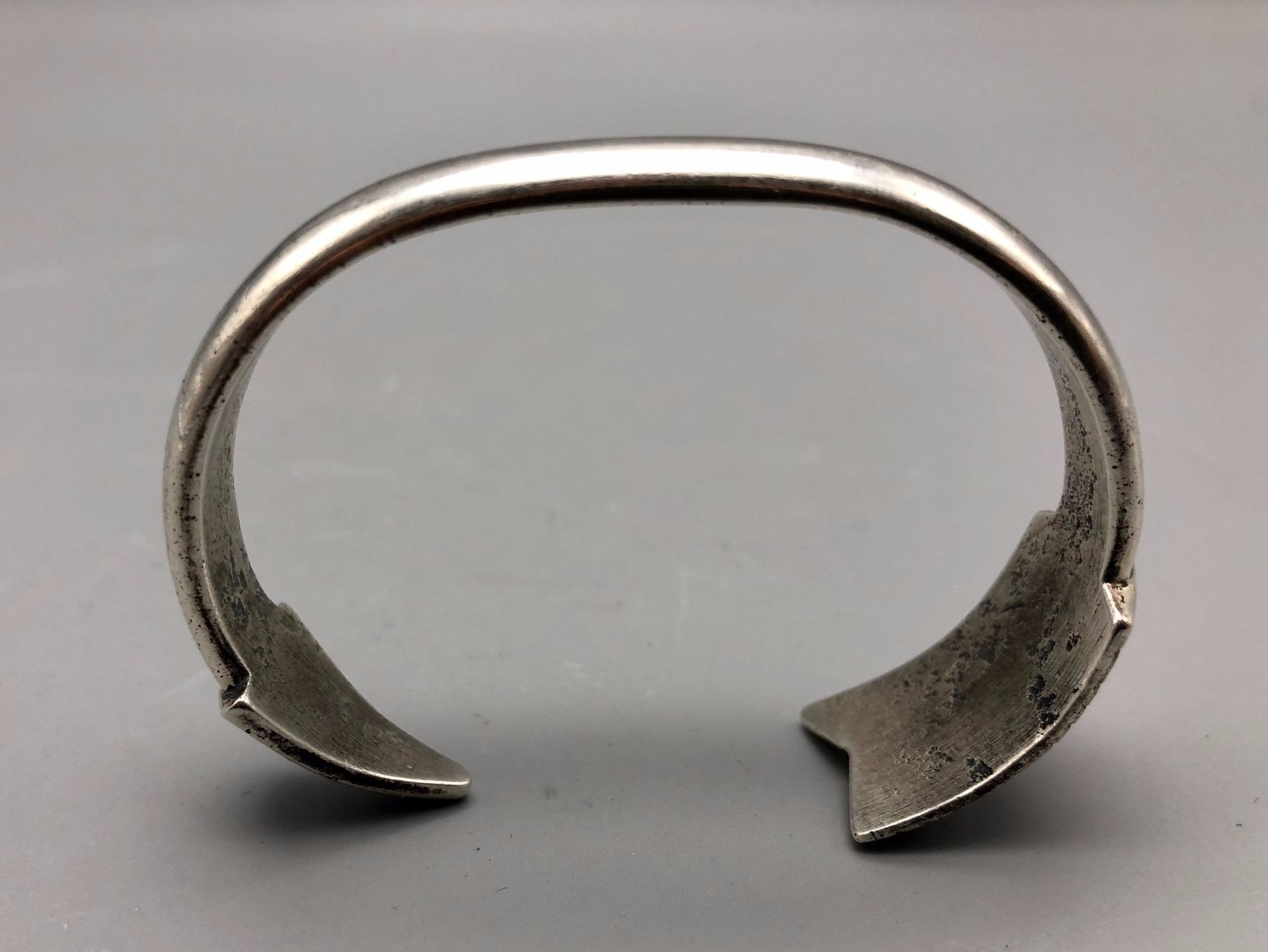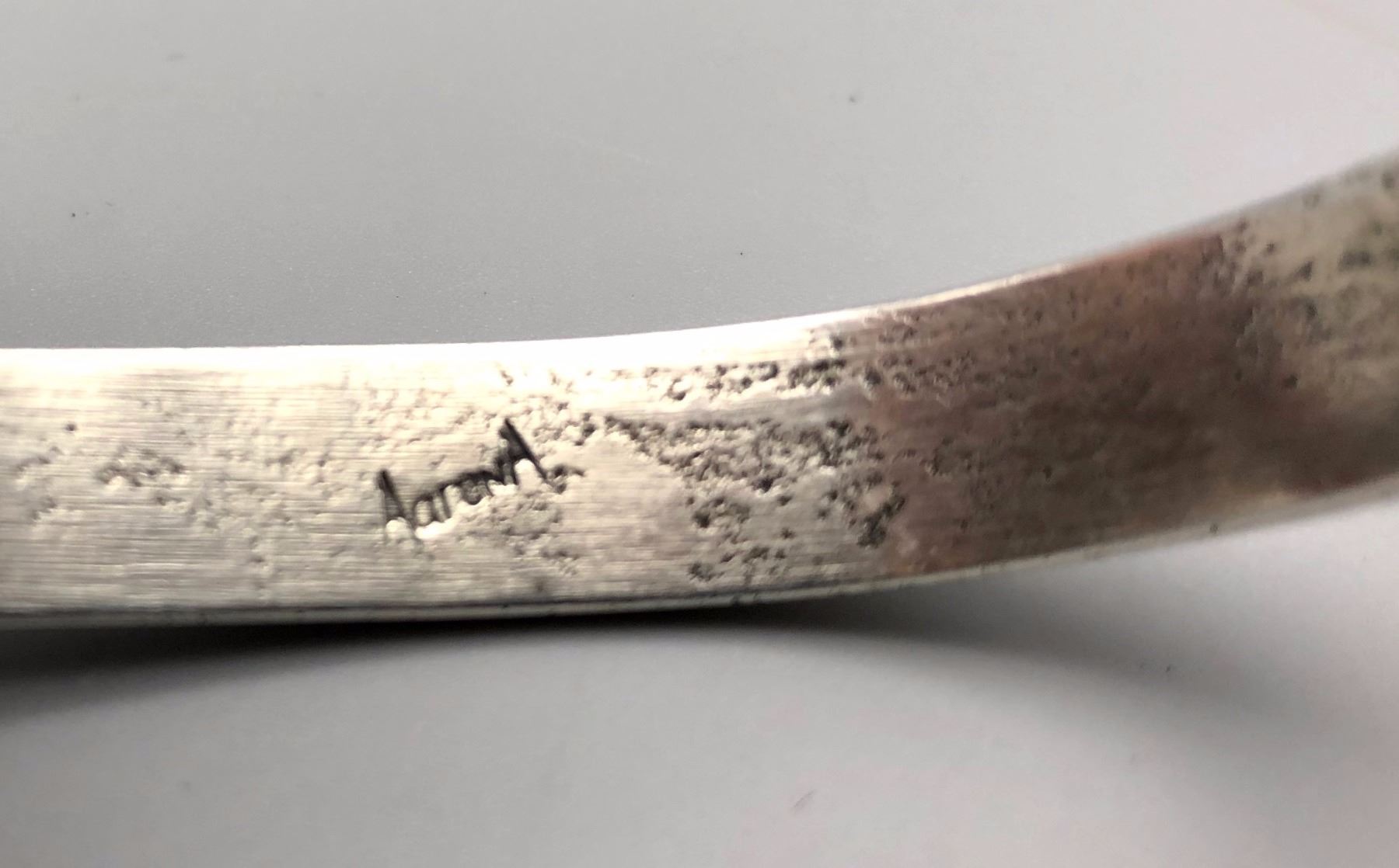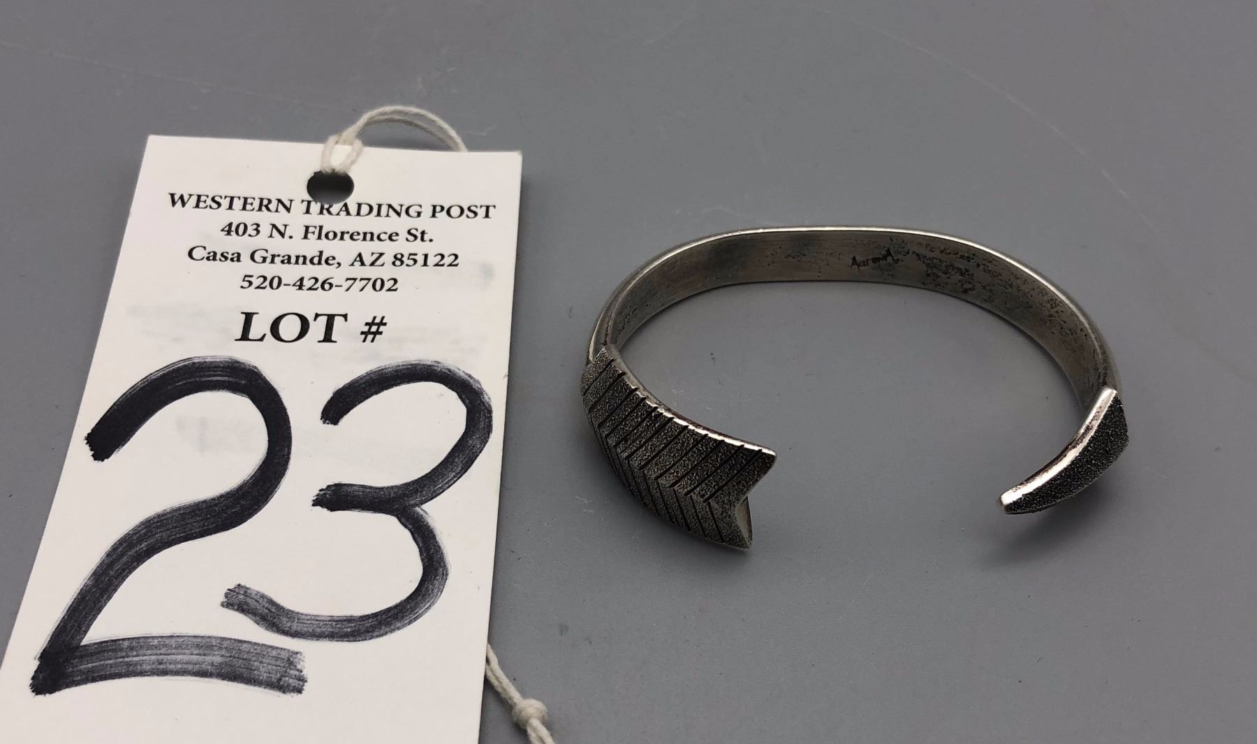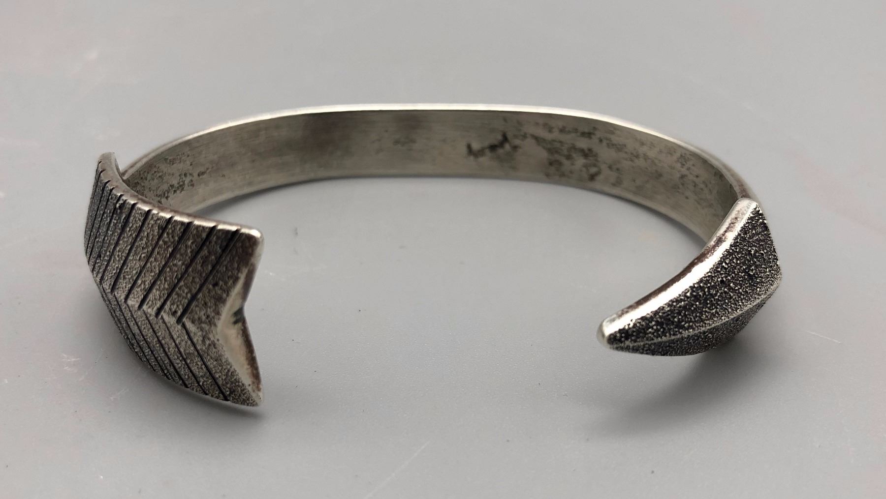 Maker: Aaron Anderson, Navajo. Approx. Age: Fairly contemporary. Size: Inside circumference is 5 1/4” plus and additional 1” opening (fits 6 1/4” wrist), 5/8” wide and weighs 39. 5 g. Additional Info: Unique Handmade Arrow Bracelet by multiple award winning maker, Aaron Anderson. Condition: Good, normal wear expected. Please look closely at the pictures - they are an important part of our description. Shipping: There will be a $5 handling / packaging fee for shipping this lot. The actual cost of postage will be added on top of that.