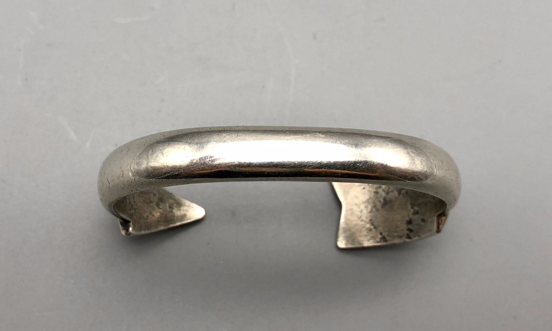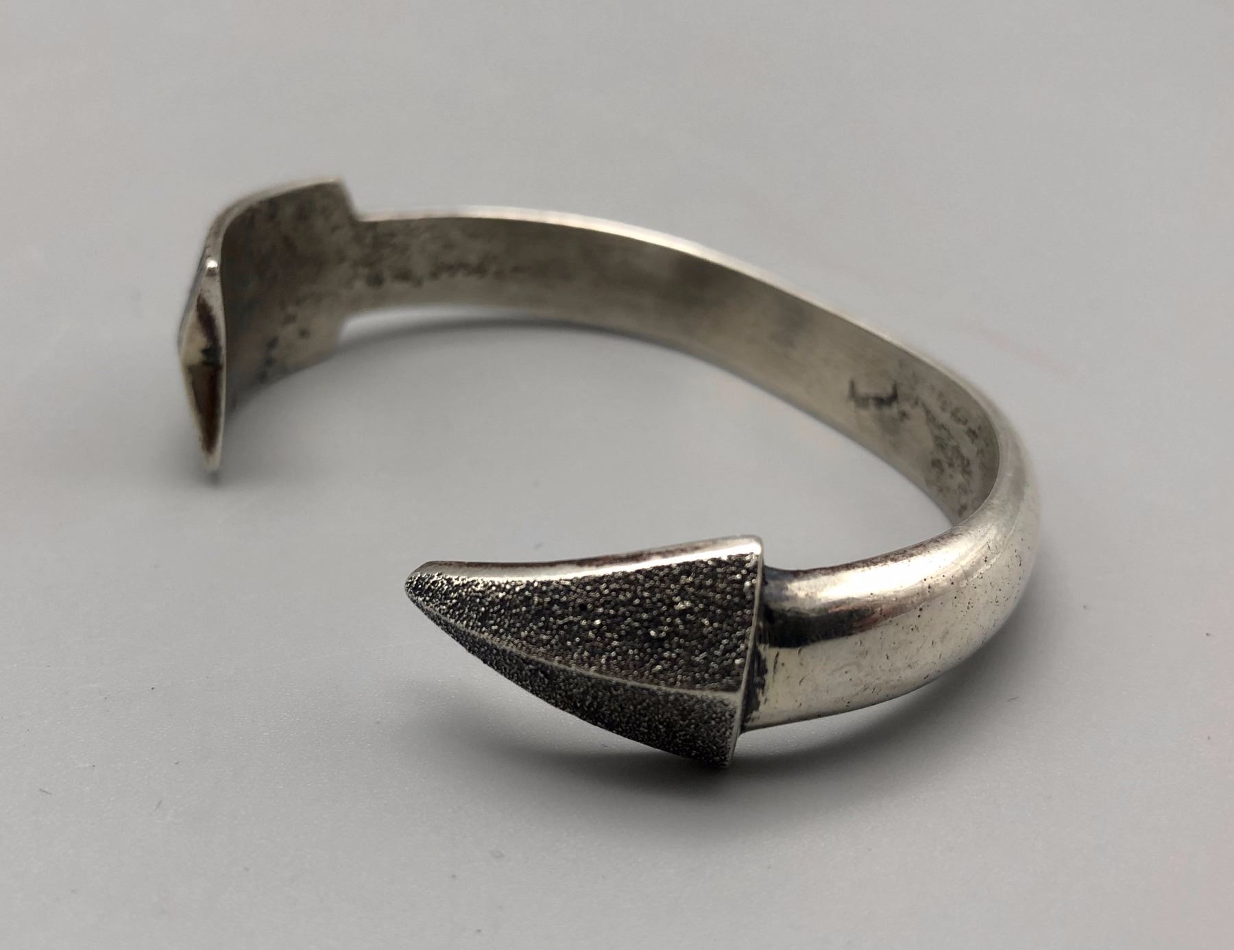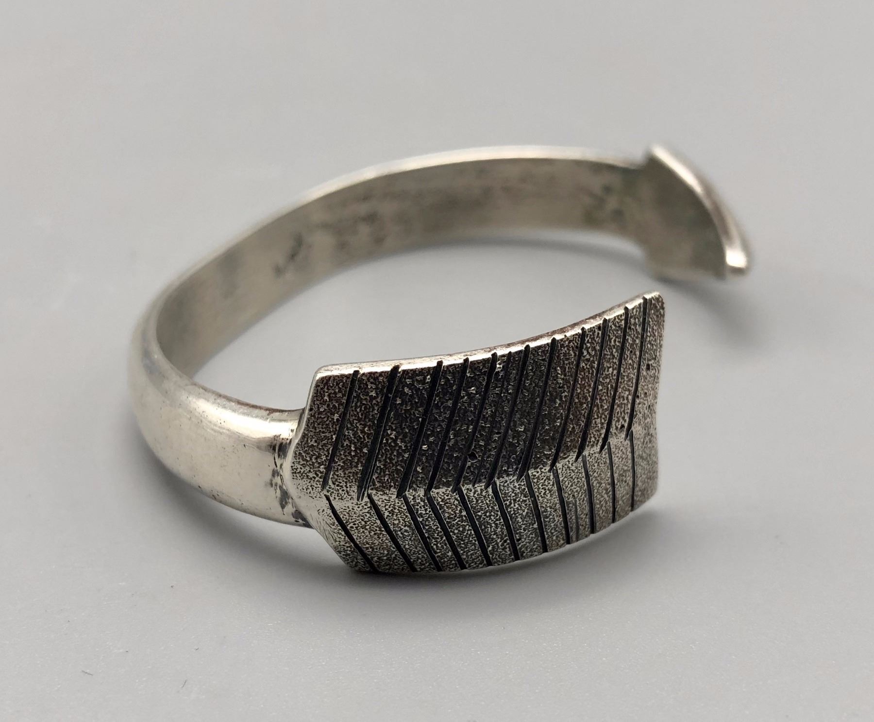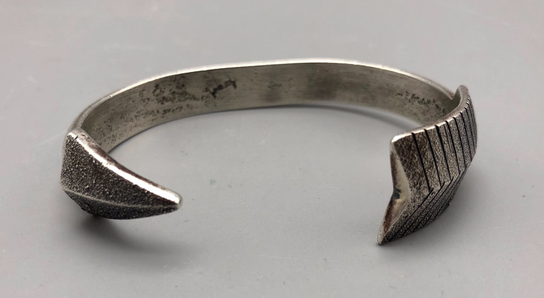Maker: Aaron Anderson, Navajo. Approx. Age: Fairly contemporary. Size: Inside circumference is 5 1/4” plus and additional 1” opening (fits 6 1/4” wrist), 5/8” wide and weighs 39. 5 g. Additional Info: Unique Handmade Arrow Bracelet by multiple award winning maker, Aaron Anderson. Condition: Good, normal wear expected. Please look closely at the pictures - they are an important part of our description. Shipping: There will be a $5 handling / packaging fee for shipping this lot. The actual cost of postage will be added on top of that.