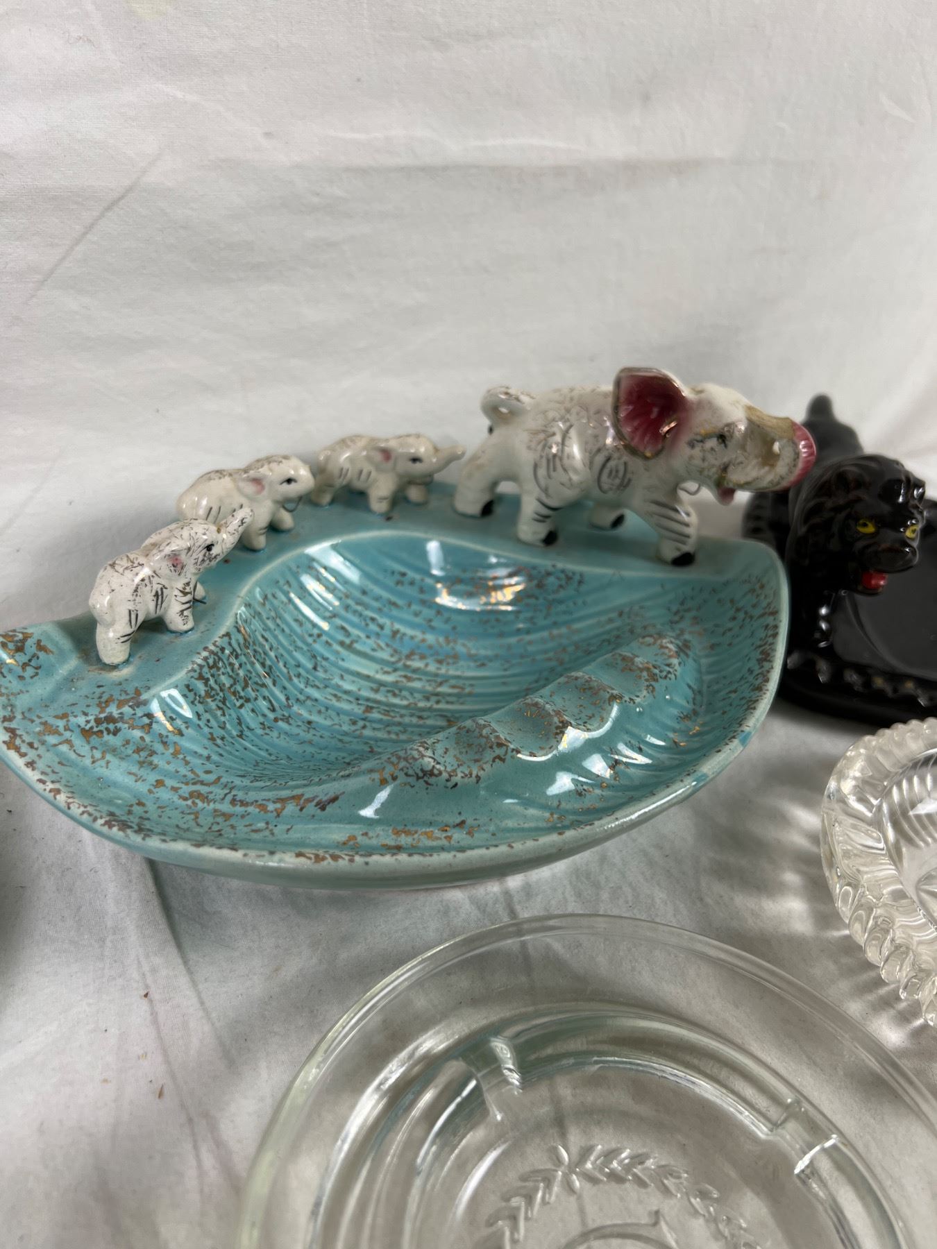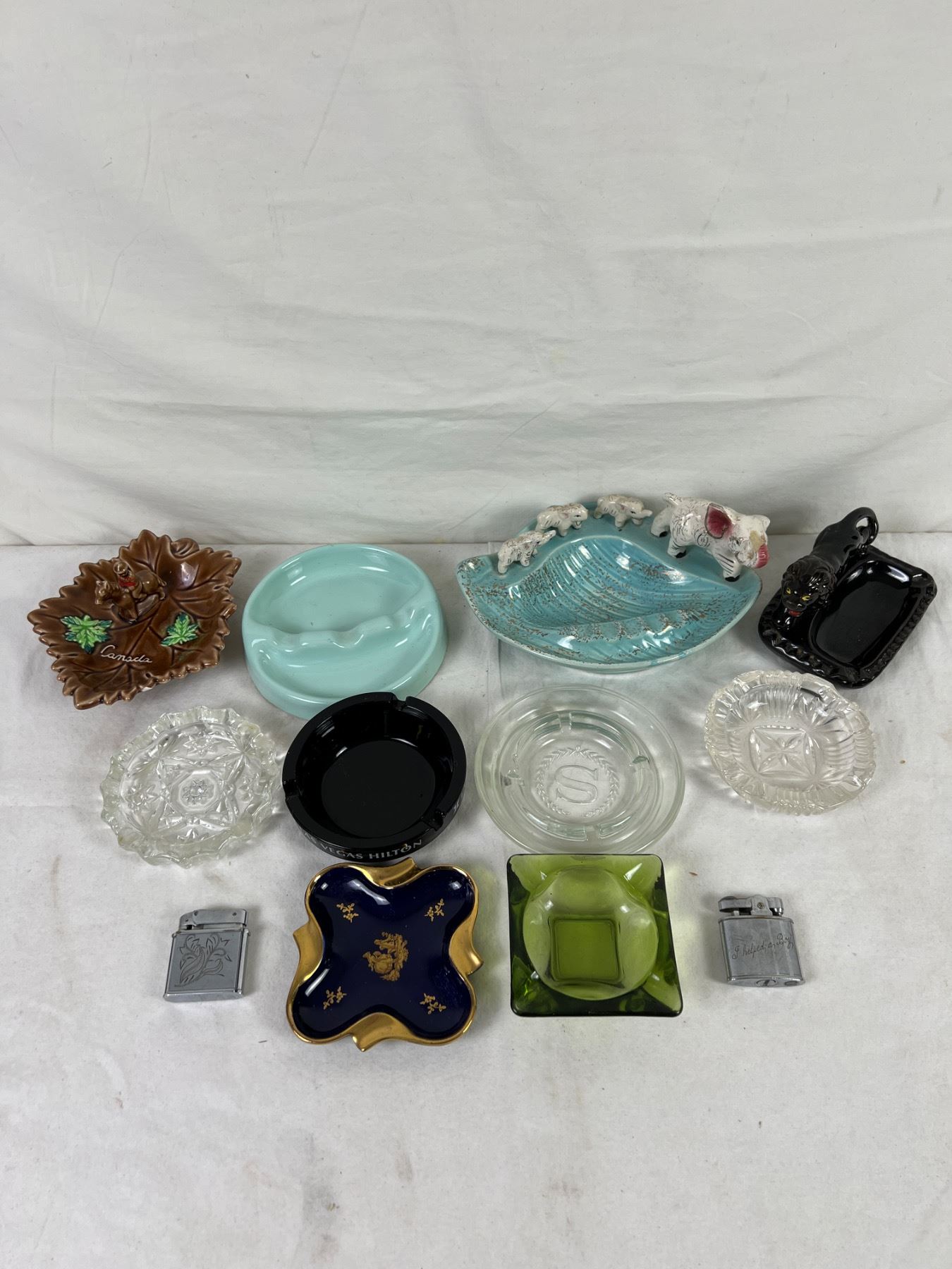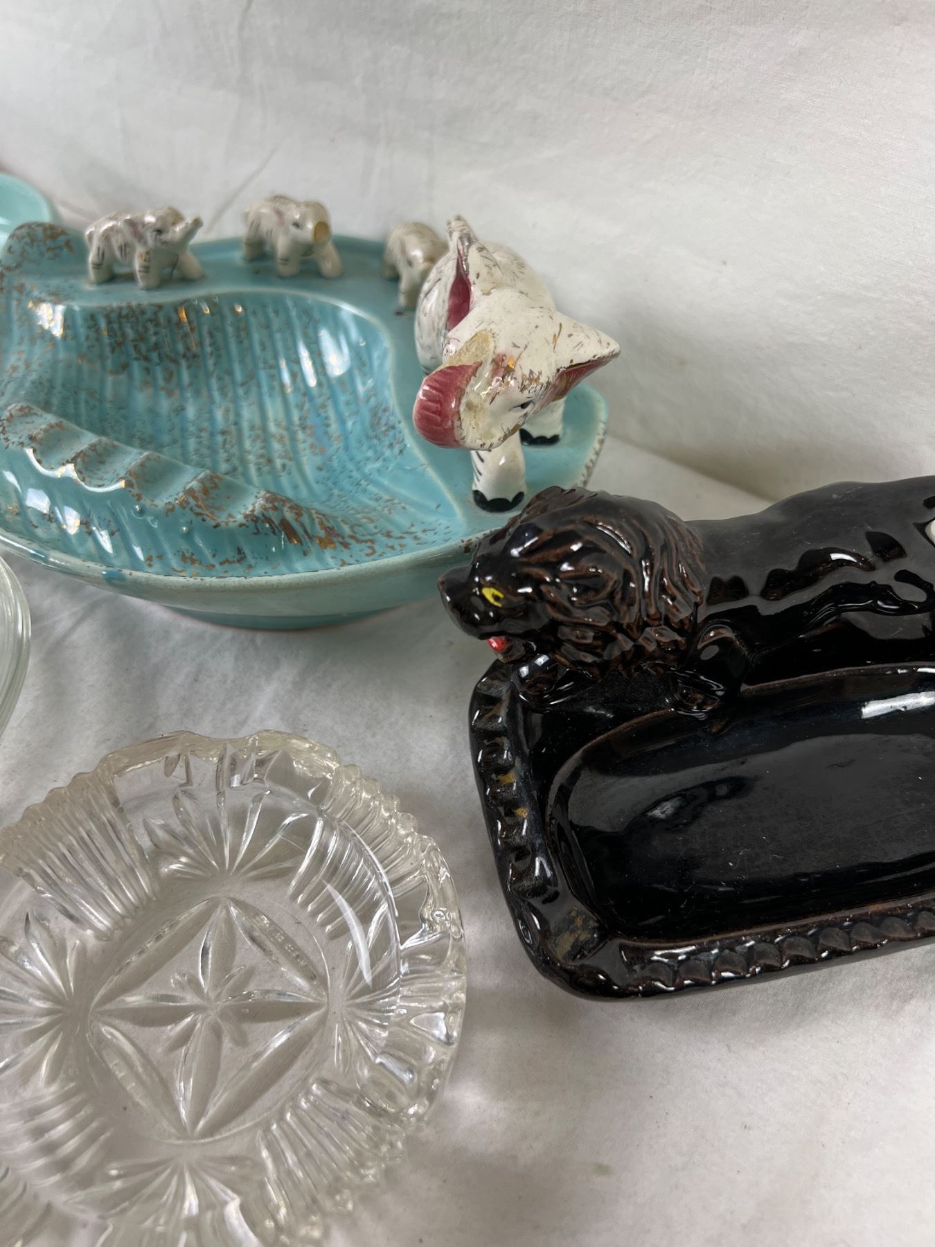 Largest tray is 8" wide and 6" deep. Various chips to ceramics, notably elephant trunk. Lighters do not spark.