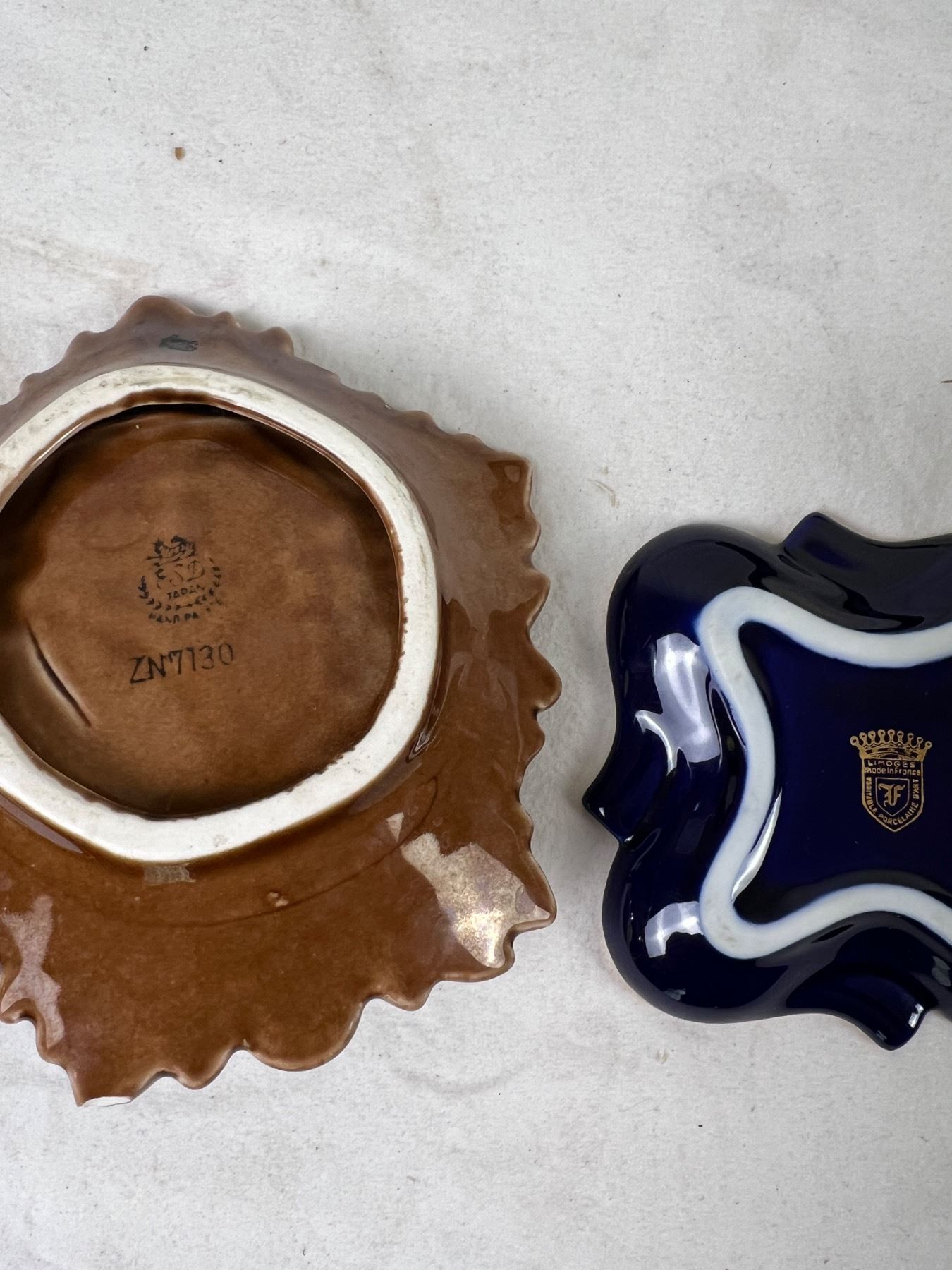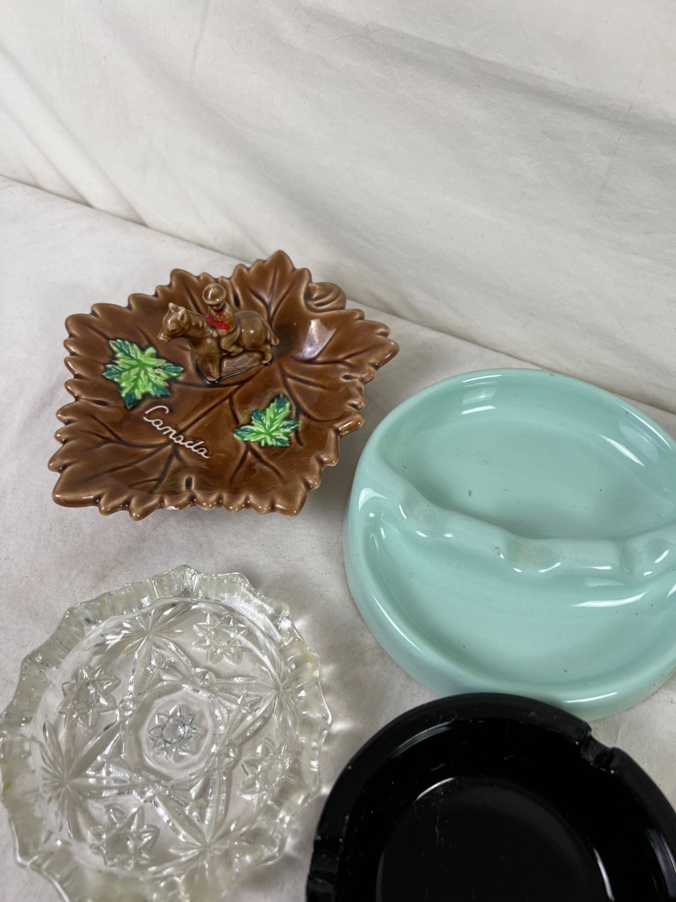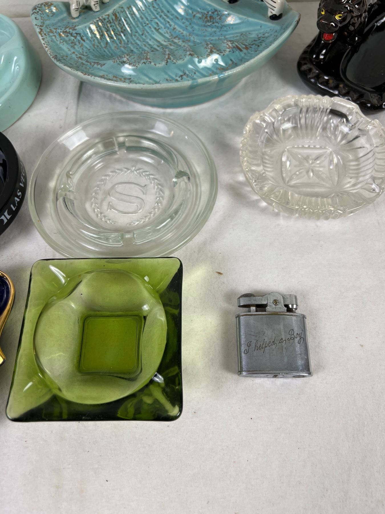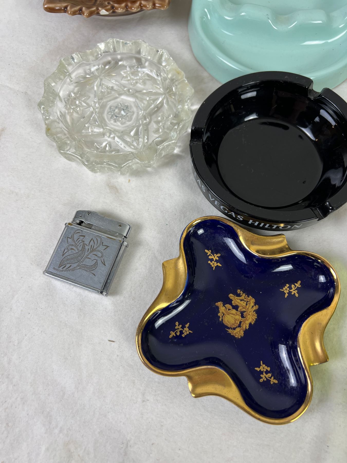 Largest tray is 8" wide and 6" deep. Various chips to ceramics, notably elephant trunk. Lighters do not spark.