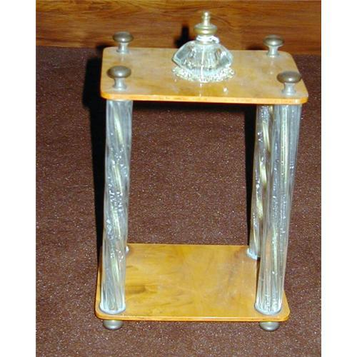Maize bakelite shelf/stand with glass swirl columns, brass hardware on top and bottom. Great to display special items. Buyer pays shipping and handling costs.