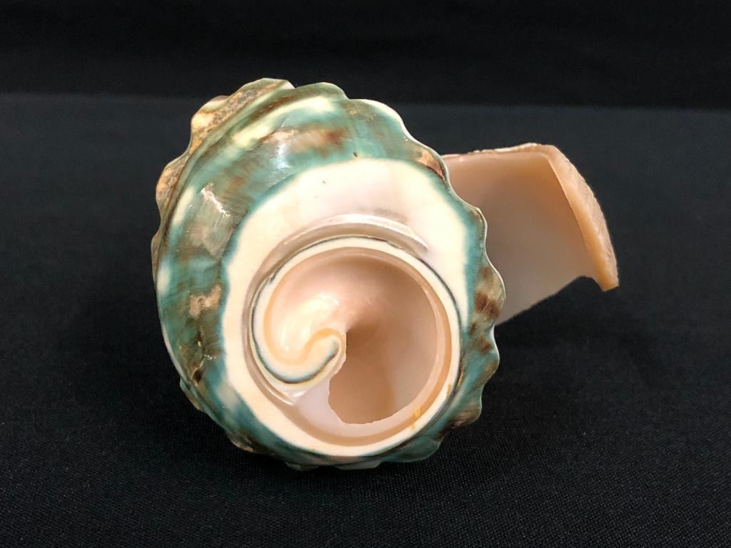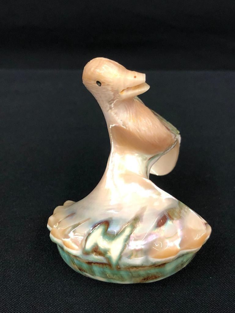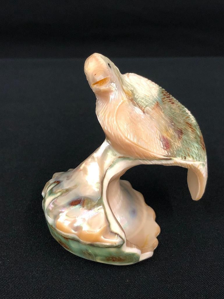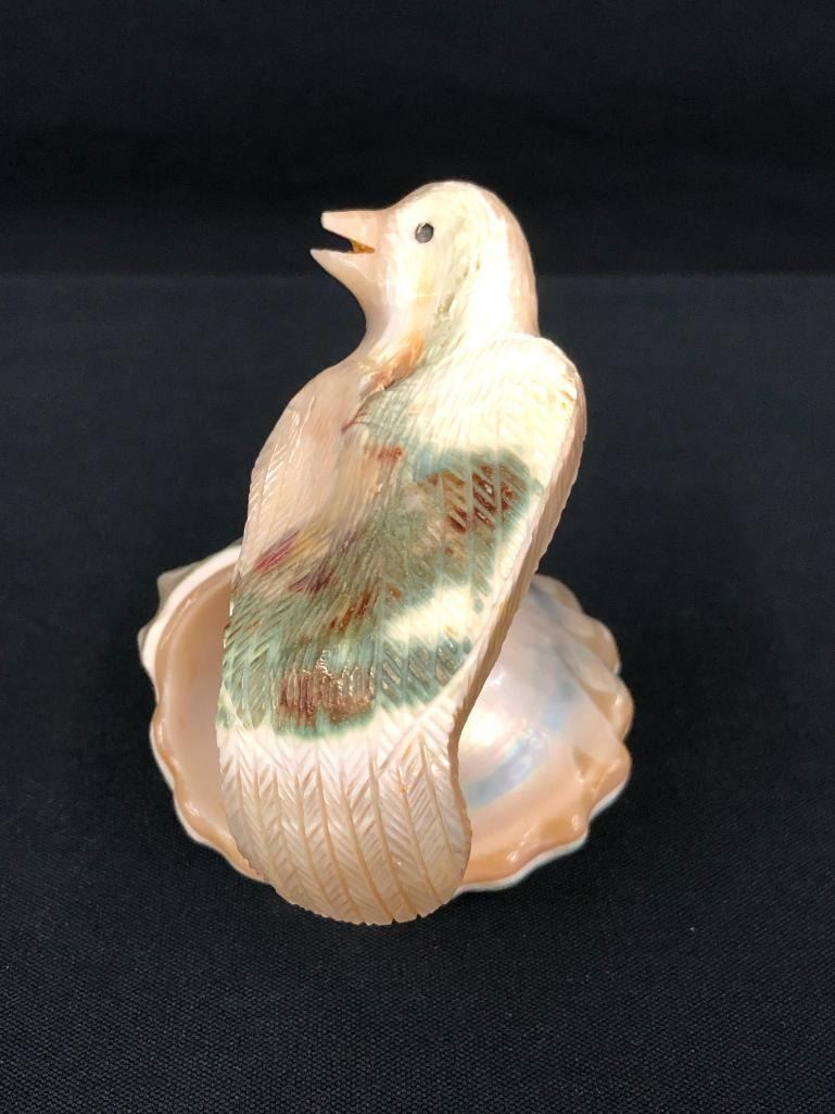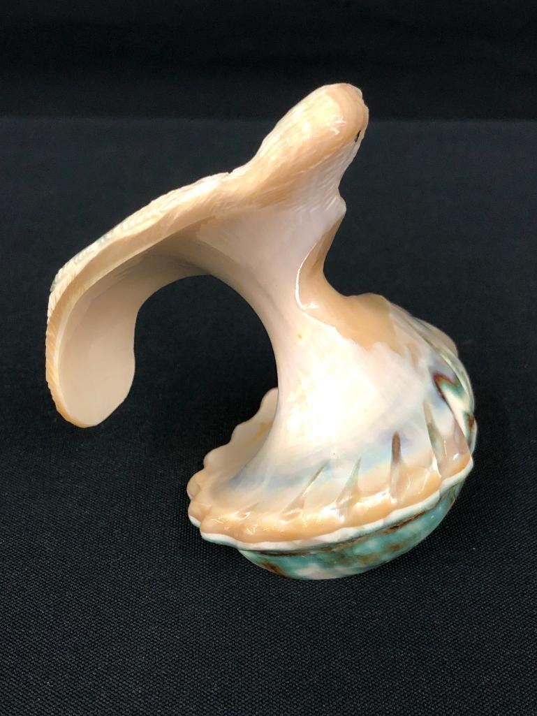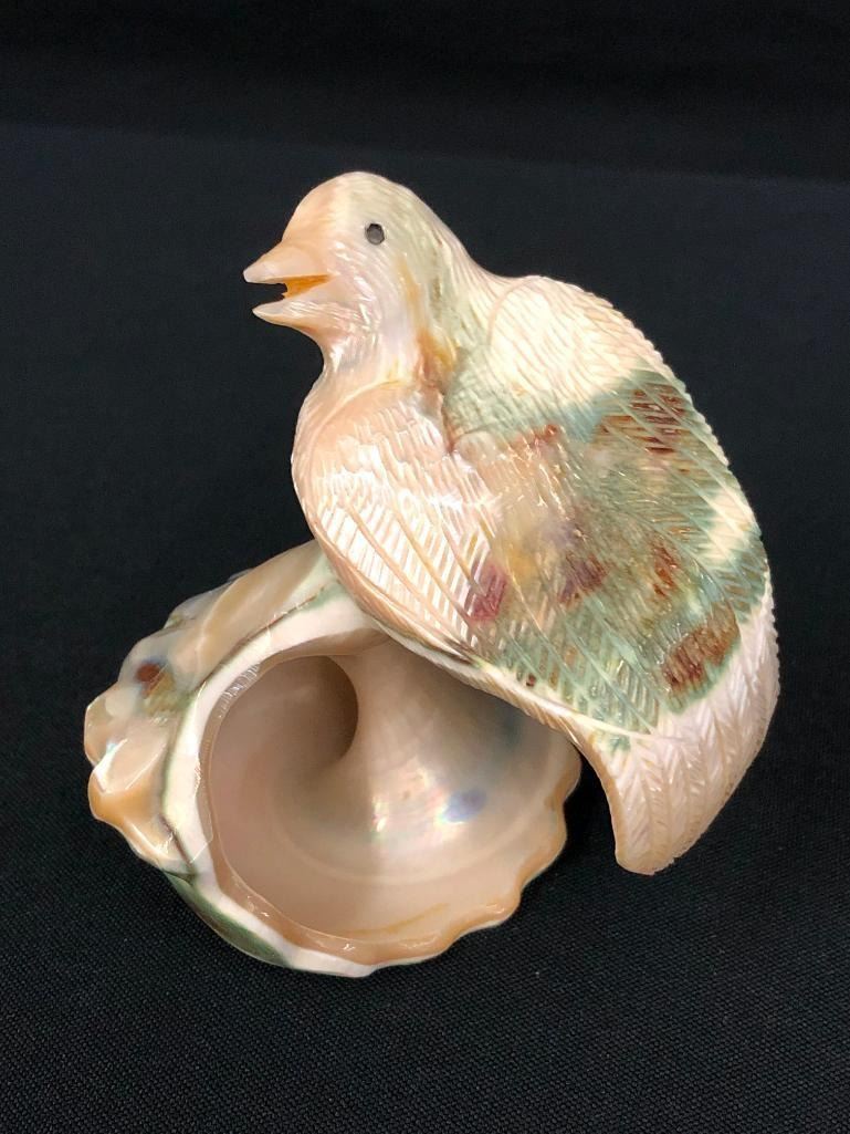 For sale in this lot is a unique bird fetish carved from a shell. This fetish is highly detailed to bring out the accents of the shell. Nicely done - a must see! MAKER: Unmarked. APPROX AGE: Circa 1980s. SIZE: 3 inches wide x 2-3/4 inches tall. CONDITION: Good for its age, normal wear expected. Please look closely at the pictures as they are an important part of our description and are hereby incorporated into the description, specifically with regards to condition. SHIPPING: There will be a $5 handling / packaging fee for shipping this lot. The actual cost of postage will be added on top of that. BUY IT NOW: If you would like to buy this item now, without waiting for the auction day to bid on it, we do offer this option (which is available up to 48 hours before the actual auction starts). The “Buy it Now†price is the high estimate of this lot (plus applicable fees and the Buyer's premium is discounted to 10% when using the Buy it Now option). If you would like to exercise this option, you must contact us by email (or phone as long as you talk to someone live). Reference this lot number and your intention to "Buy it Now."
