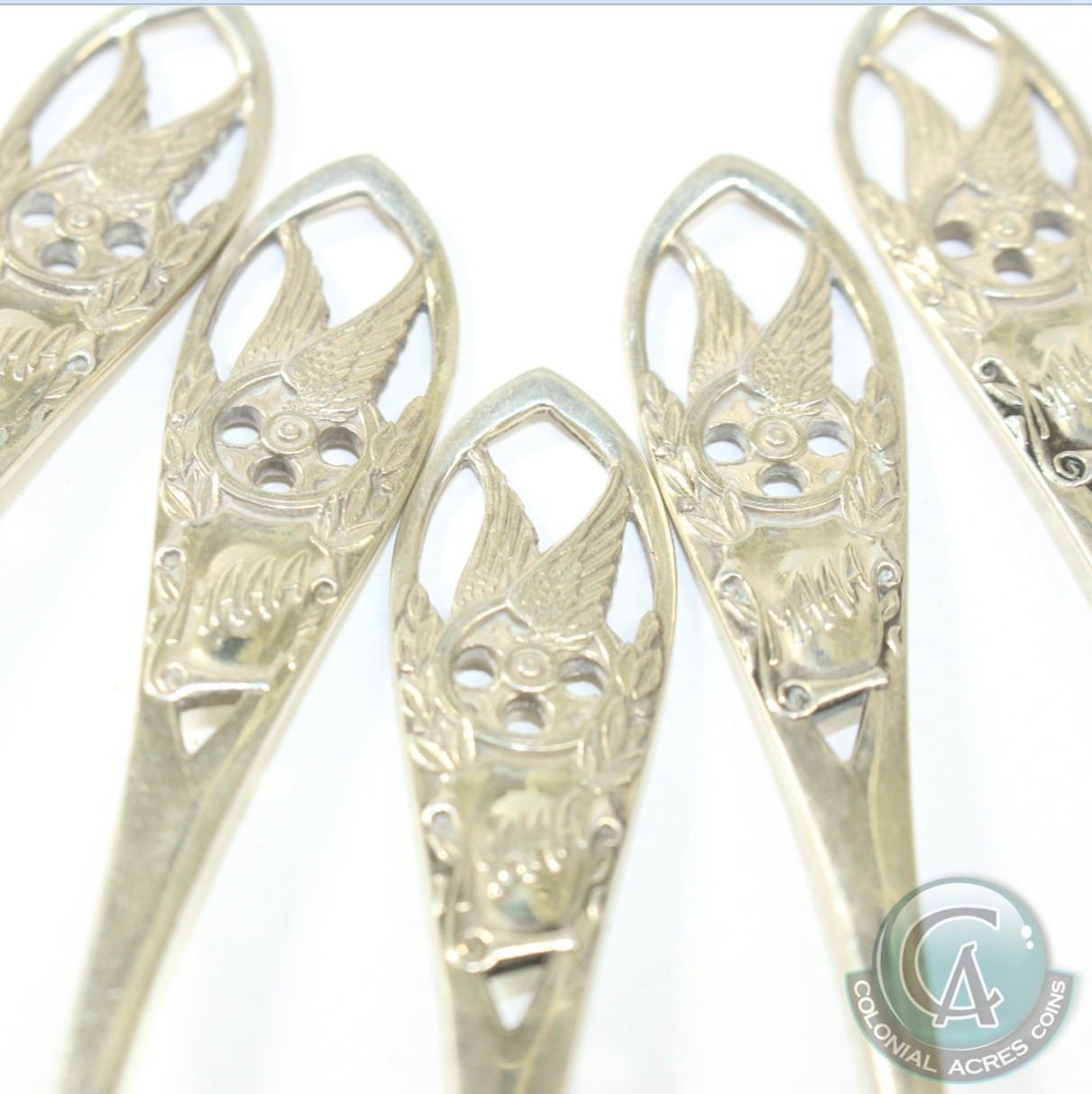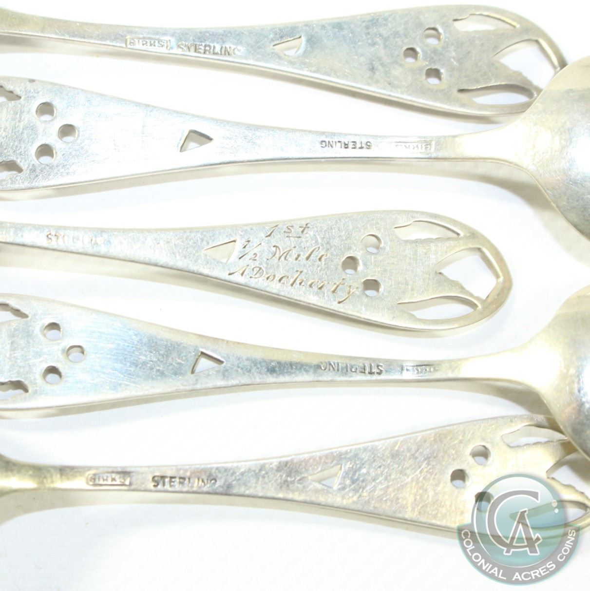 Unique Birks Sterling Spoon set with Pierced Flying Tire Design. Presented as an award as etched- 1st 1/2 Mile A. Docherty. 77.7 grams.