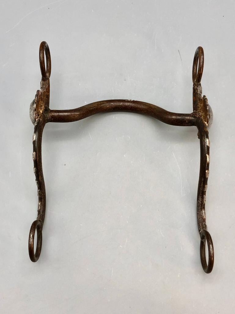 For your consideration is another unique bit by Stan Ruano. Similar to the bit in lot number 11, it has a unique style to it, but it must have worked because it has been well used. It is nominally decorated with silver inlay and conchos. MAKER: Marked, SR connected and attributed to Stan Ruano. APPROX AGE: Circa 1970s - 80. SIZE: Mouth is 5 inches. Overall is 8 inches. CONDITION: Good for its age, normal wear expected. Please look closely at the pictures as they are an important part of our description and are hereby incorporated into the description, specifically with regards to condition. SHIPPING: There will be a $5 handling / packaging fee for shipping this lot. The actual cost of postage will be added on top of that. BUY IT NOW: If you would like to buy this item now, without waiting for the auction day to bid on it, we do offer this option (which is available up to 48 hours before the actual auction starts). The “Buy it Now” price is the high estimate of this lot (plus applicable fees and the Buyer's premium is discounted to 10% when using the Buy it Now option). If you would like to exercise this option, you must contact us by email (or phone as long as you talk to someone live). Reference this lot number and your intention to "Buy it Now."