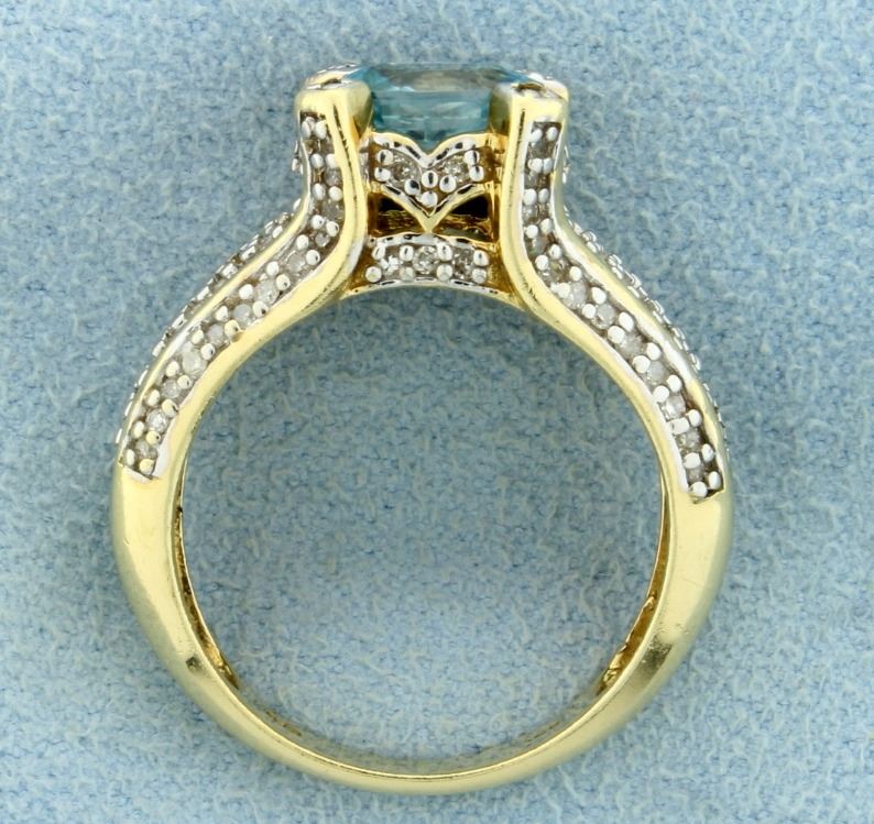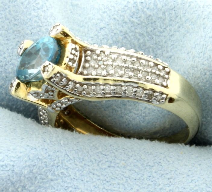In 14K yellow gold, this ring contains one 1.5ct oval blue topaz gemstone and one hundred 1/2pt diamonds. Lots of sparkle! Size 8 1/4 6.1g