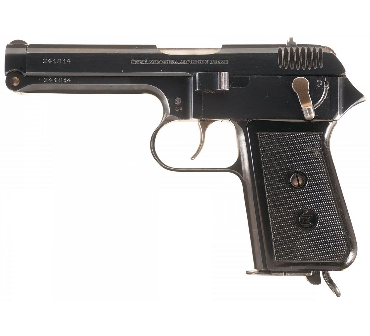 Introduced in 1938, production of the Vz38 was cut short by the Nazi Occupation. A limited number are known to have been delivered to Bulgaria, with the 38's double action only mechanism converted to single/double action, along with the installation of a thumb safety. Blade and notch sights, with the one line "PRAZE" (Prague) address on the left side of the slide, stacked matching slide and frame numbers, "Rampant Lion on N/41" on the left side of the frame, with the straw finished safety lever on the side plate with positions marked "O" (fire) and "Z" (safe). Checkered wraparound grips, with "CZ" imprints and bottom-mounted magazine catch.