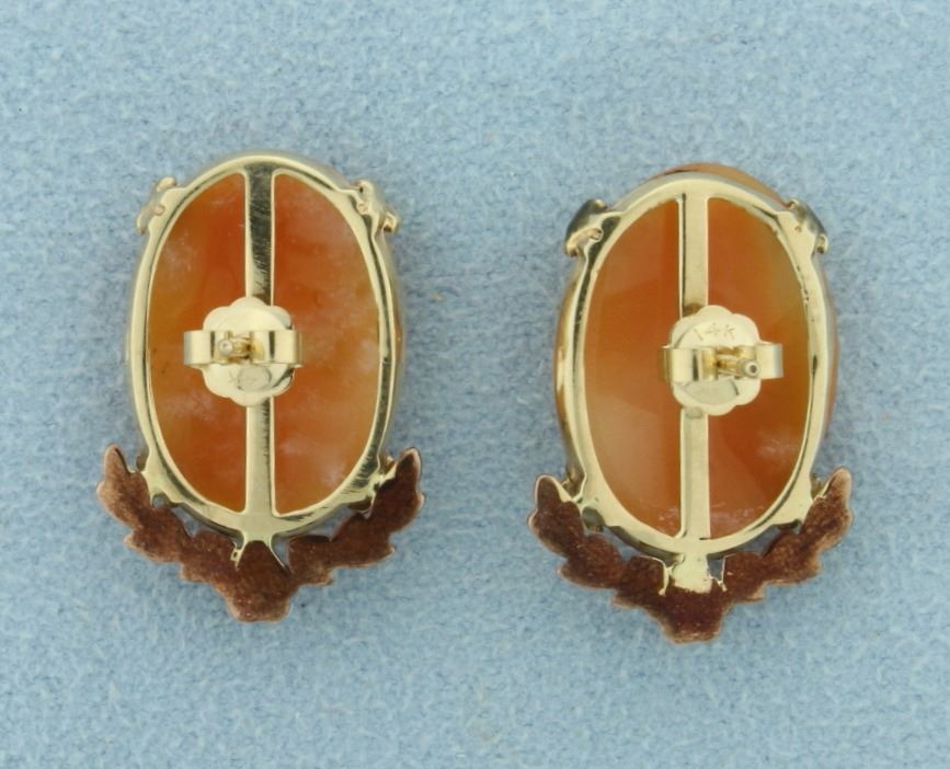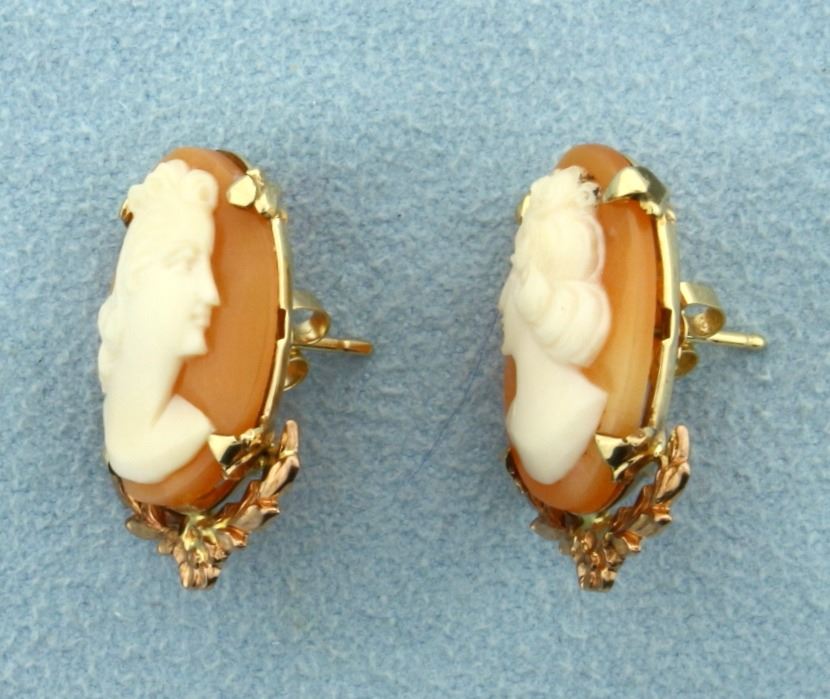 In 14K Yellow and Rose Gold. Each earring has an 18x13mm Cameo with detailed design. 7/8" long, with friction backs. 4.9g