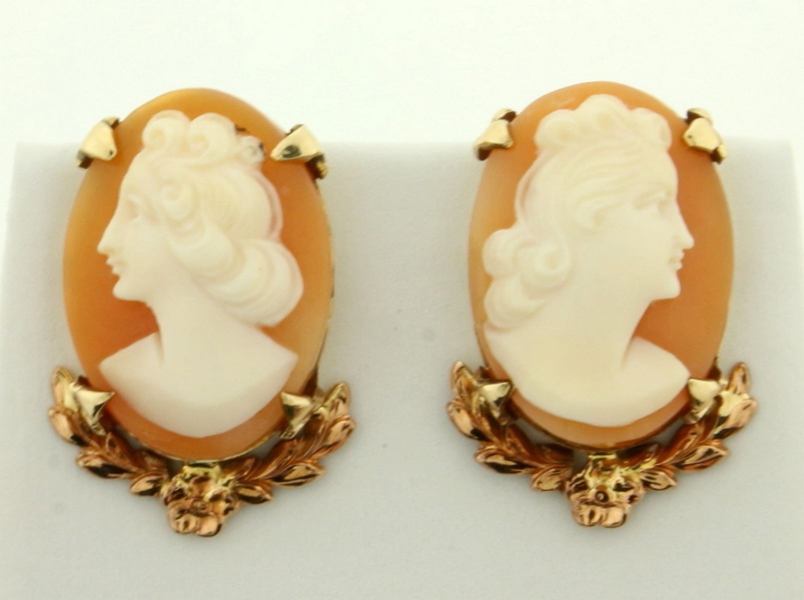 In 14K Yellow and Rose Gold. Each earring has an 18x13mm Cameo with detailed design. 7/8" long, with friction backs. 4.9g