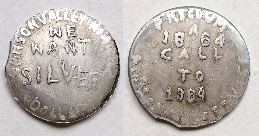 Side one says Carson Valley Kiwanis / We Want Silver / Dollar. Reverse says Freedom / 1864 / A Call To / 1864 / Personal Service. Hand made. Dented, worn, and parts are difficult to read. But you may never find anything like this again.