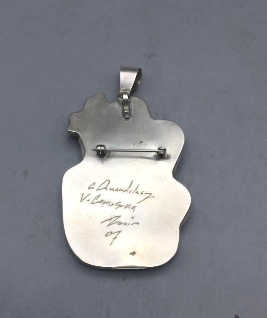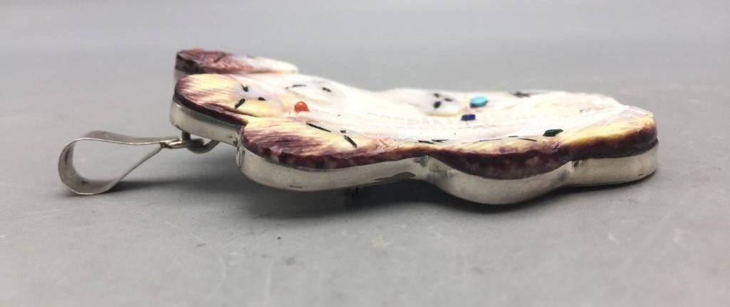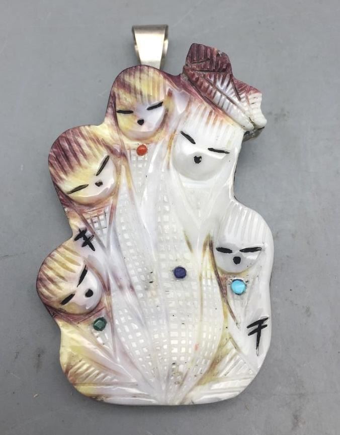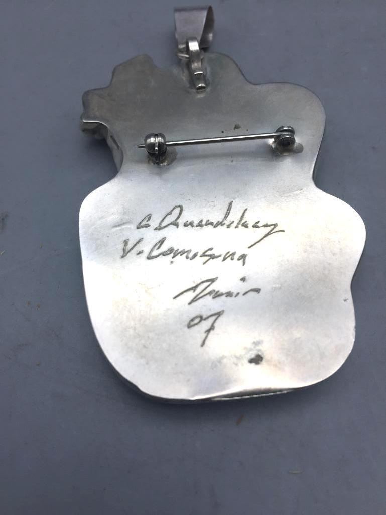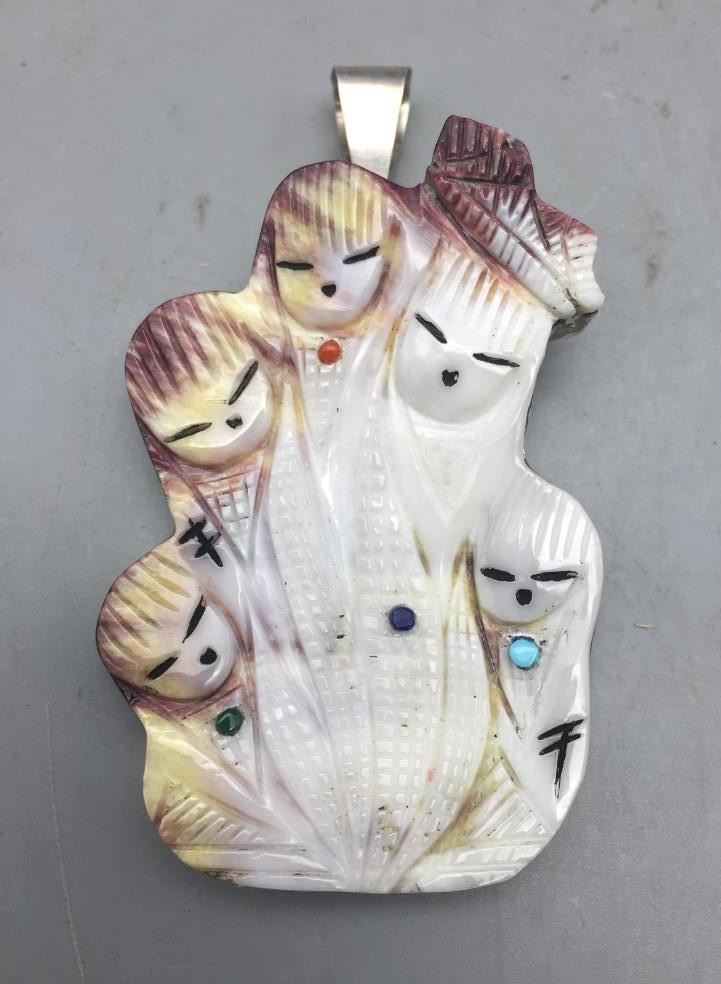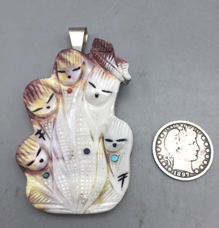 For sale in this lot is a beautiful carved Zuni storyteller pendant. It is made from shell with coral, turquoise, onyx, malachite and sugulite accents. This pendant can also double as a pin/brooch. Maker: Marked, C.Quandelacy and V. Comosona, Zuni. Approx. Age: Fairly modern. Size: 3-1/8" long X 1-3/4" wide. Weighs 25.9 grams. Condition: Good for its age, normal wear expected. Please look closely at the pictures - they are an important part of our description. Shipping: There will be a $5 handling, packaging fee for shipping this lot. The actual cost of postage will be added on top of that.